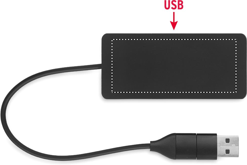 USB Hub aus recyceltem Aluminium mit Ladekabel. Ausgang: 2 x Typ-A und 1 x Typ-C. Eingang: 2-in-1 Typ-C und Typ-A. Kabellänge: 20 cm.