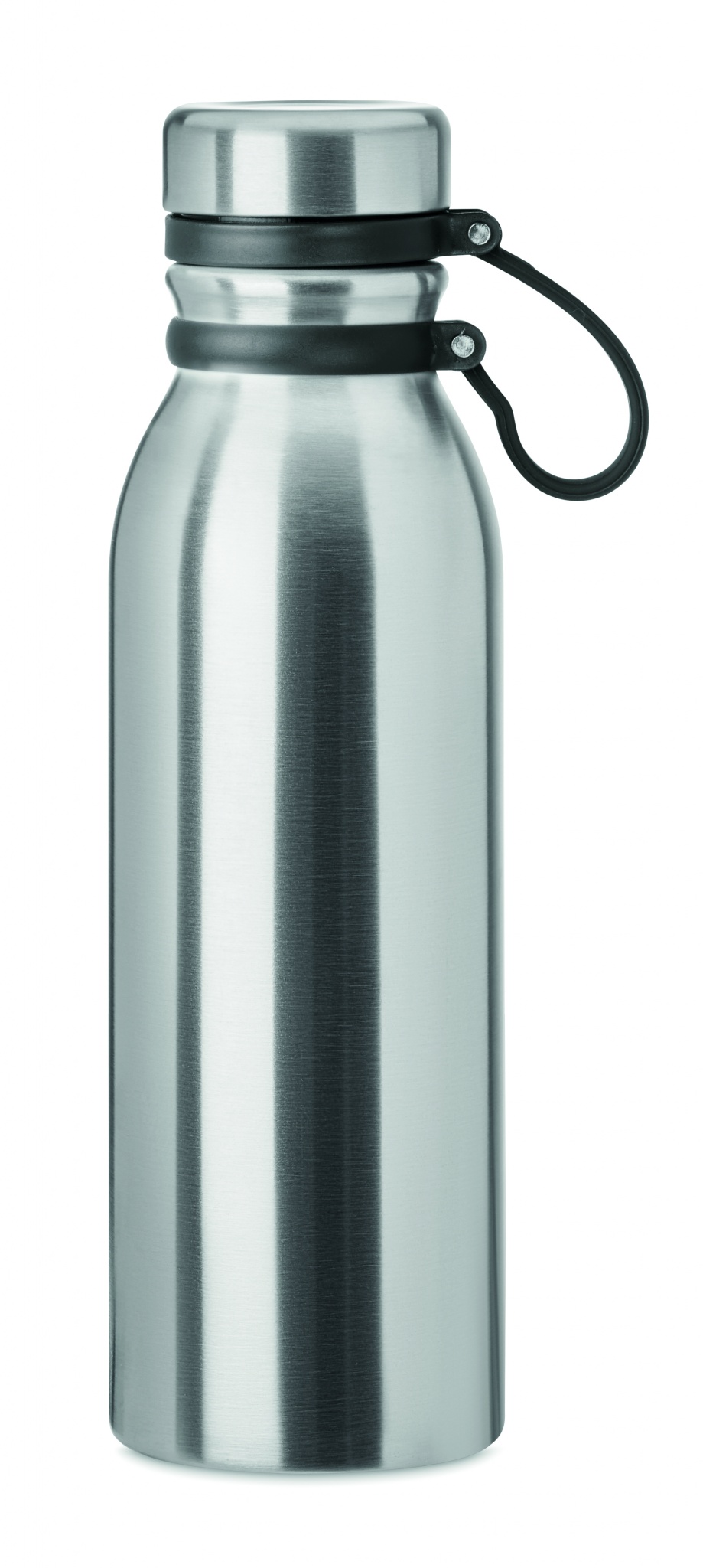 Doppelwandige Trinkflasche aus Edelstahl mit Silikon Schlaufe zum praktischen Transport. BPA frei. Füllmenge: 600 ml. Auslaufsicher.