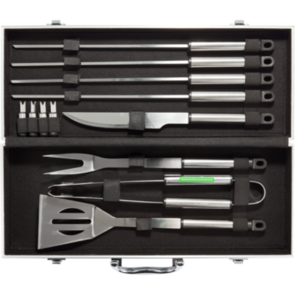 12tlg. Edelstahl Grillset, inkl. 4 Spießen, Messer, 4 Maiskolbenhalter, Bratenheber, Grillzange und -gabel mit Schutzhülle, Set konfektioniert in Aluminiumkoffer.