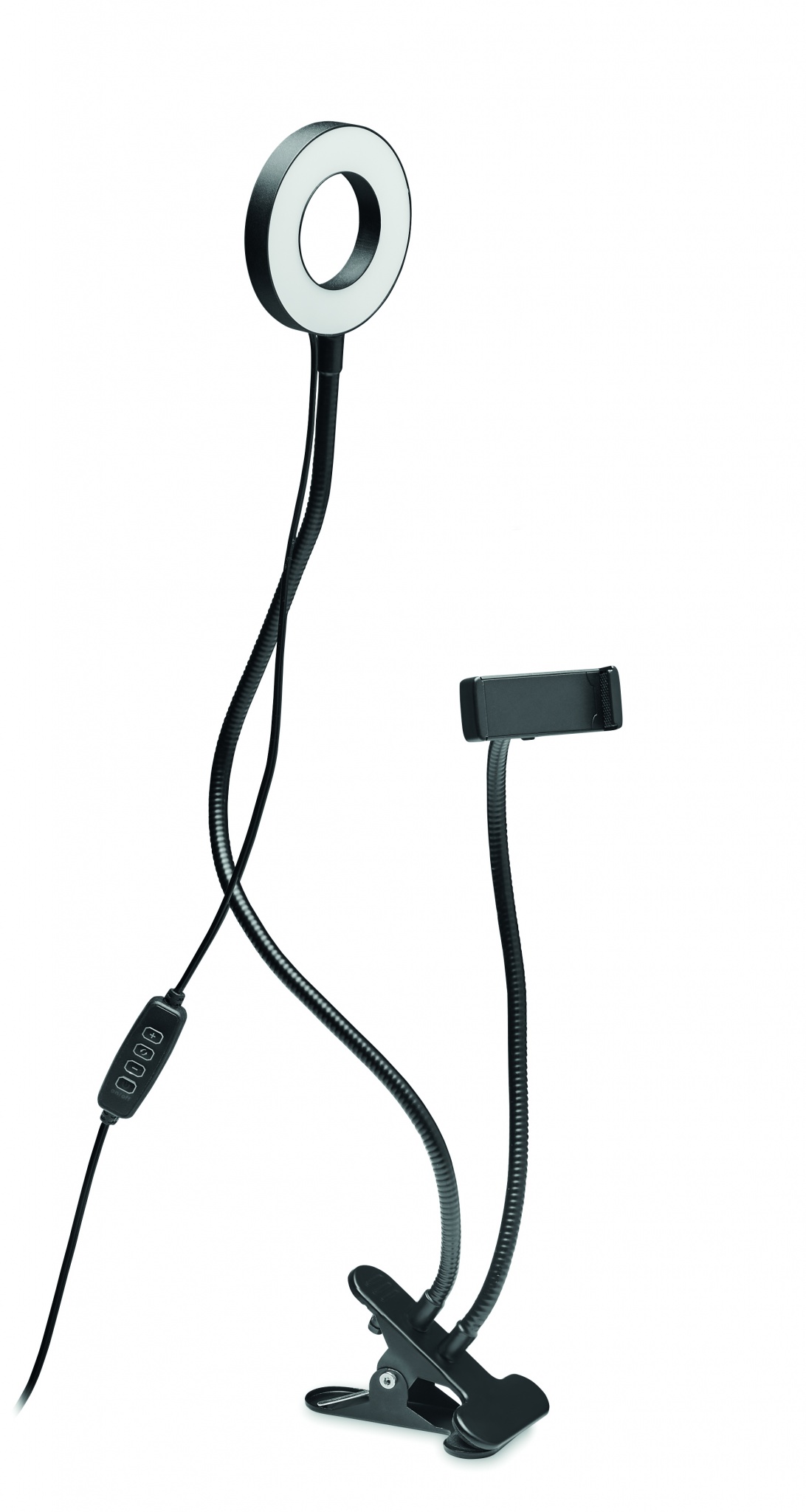 Tragbare LED-Selfie-Ringleuchte mit Smartphone Halterung und Clip. 24 cm Länge. Weißes, warmes Licht mit 3 Helligkeitsstufen. Ideal für Tik-Tok®, Live-Streaming, Broadcasting und Fotografie.