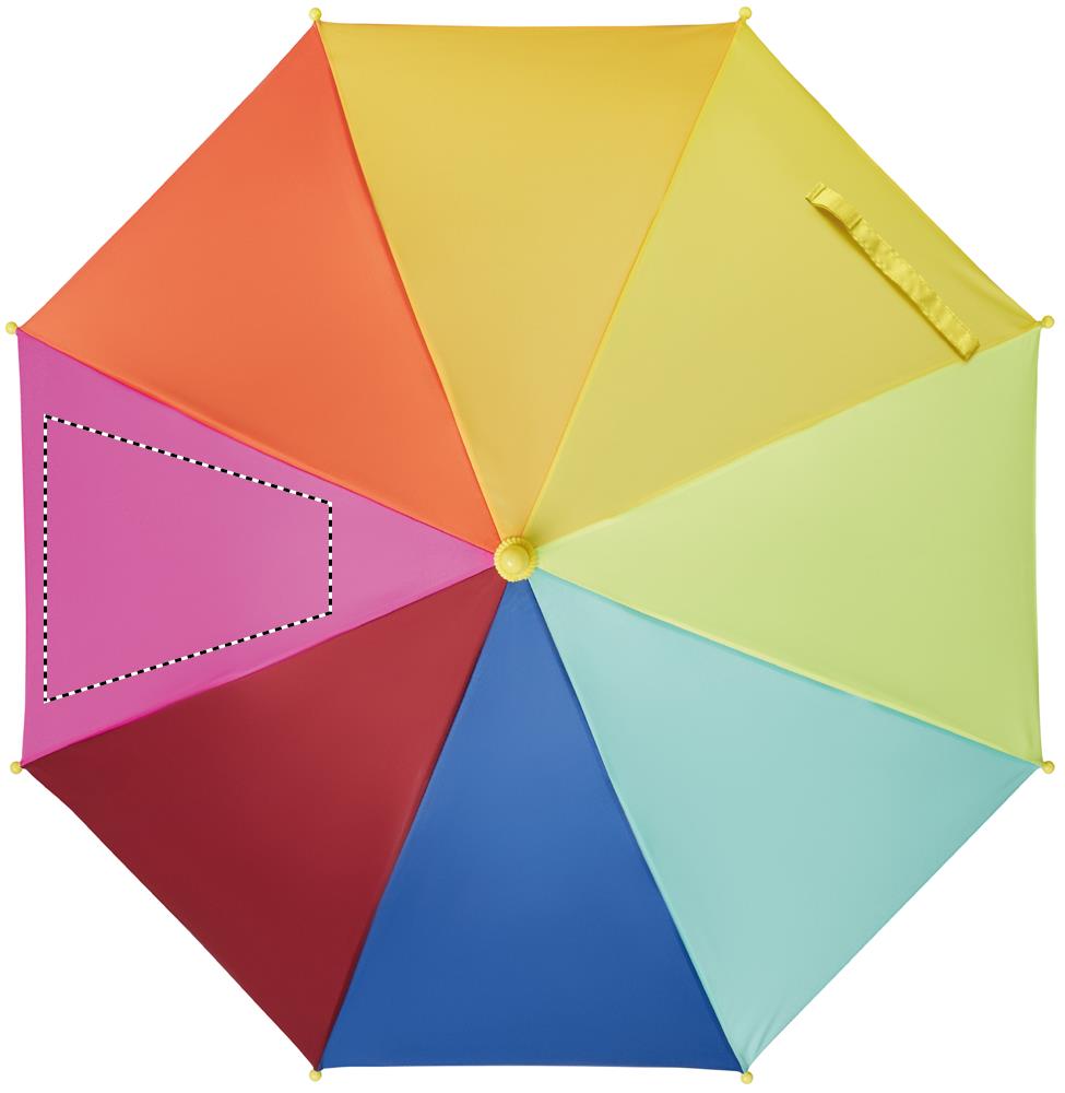 18 inch kids umbrella in 190T pongee with rainbow pattern. It has 8 panels. Manual opening and closure. Fibreglass ribs and frame. Plastic handle and tips. Curved handle.