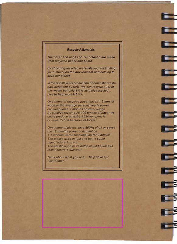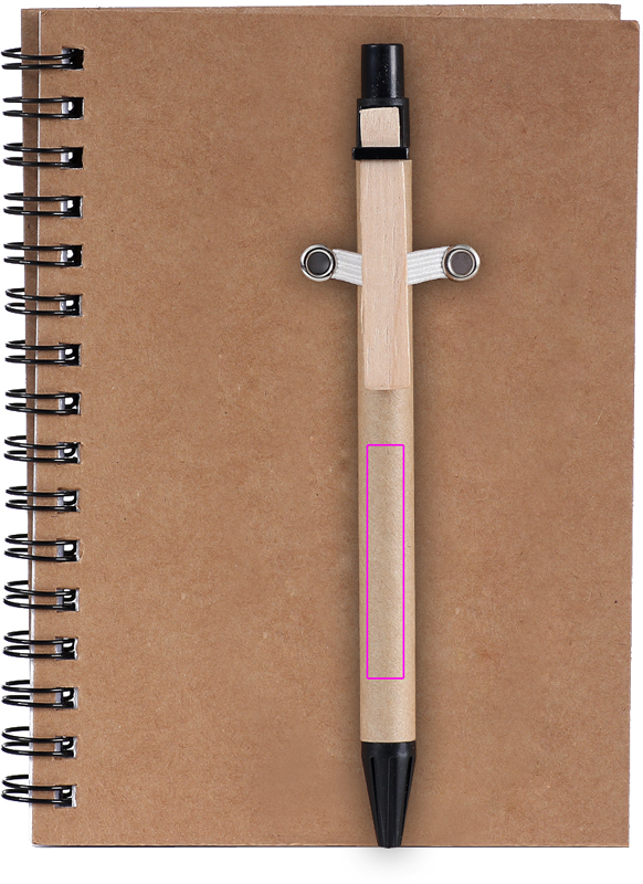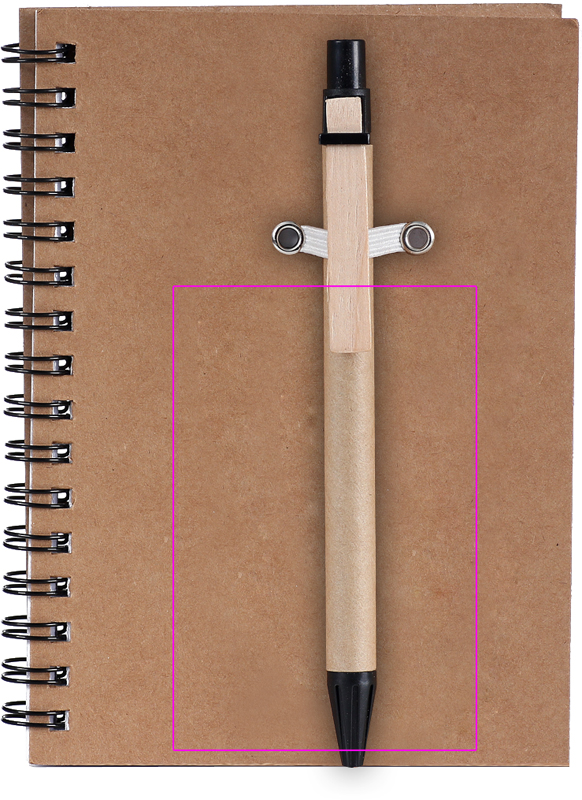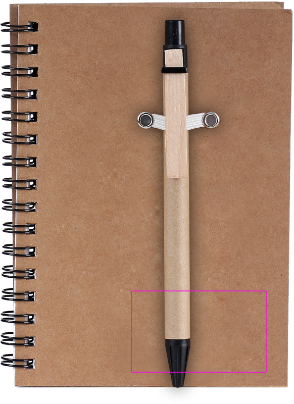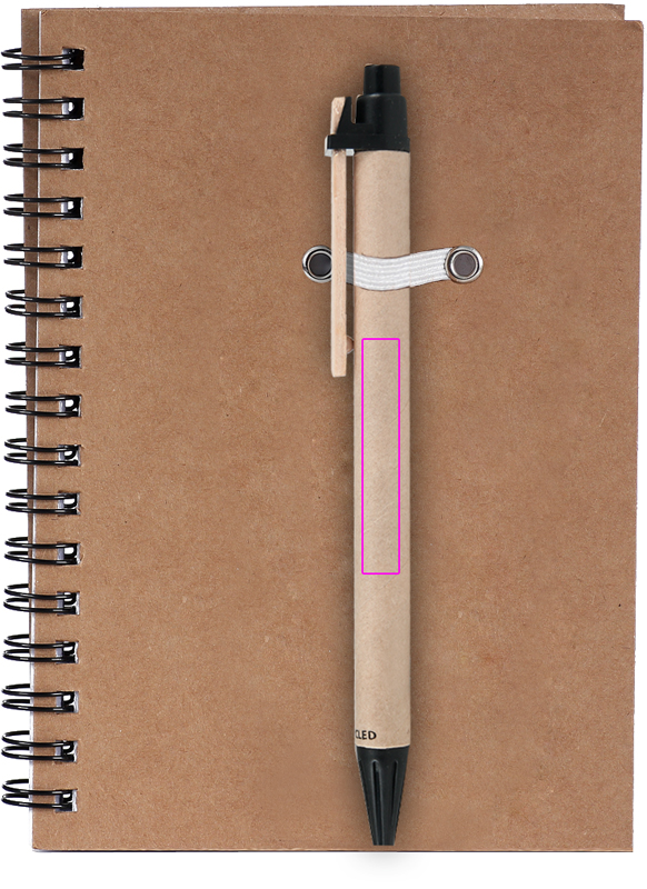 Recycled cardboard notepad with 120 pages of recycled paper and a blue ink ballpoint pen. We will print your logo on the cover.