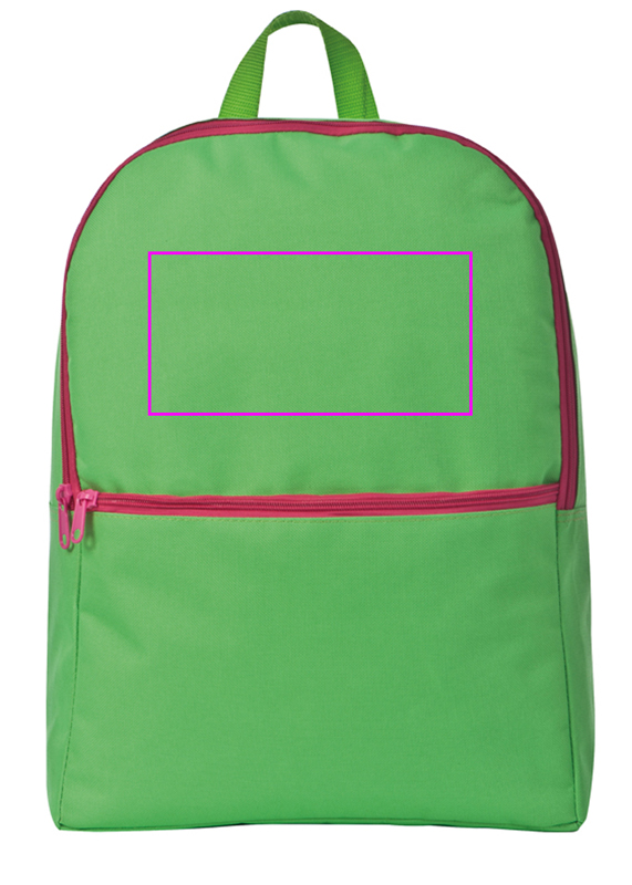 Longlasting backpack made of 600D polyester in gaudy colours with a big main compartment and an extra front compartment. Your logo will be printed on the front compartment.