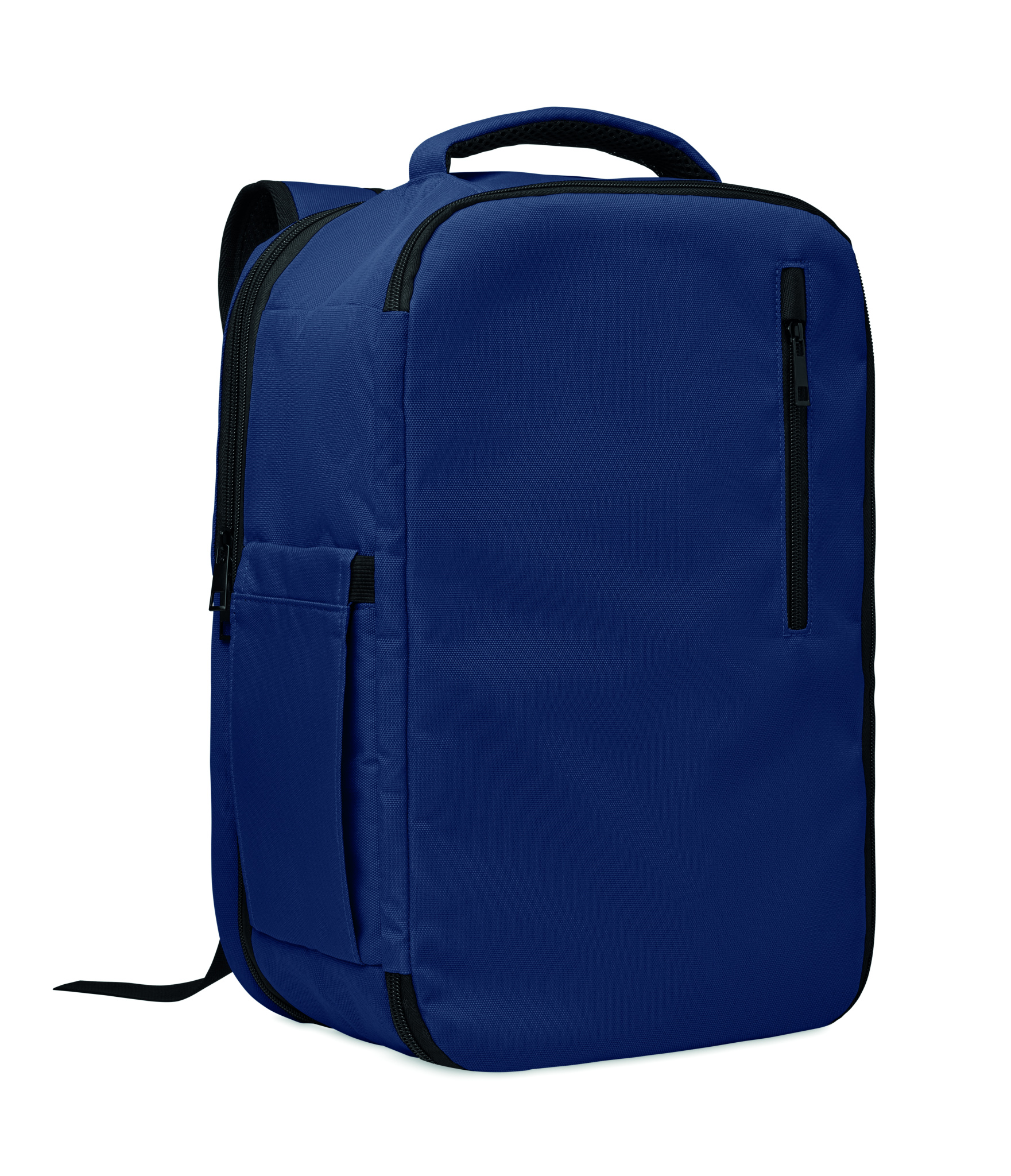 "Cabin-size carry-on extendable backpack made of 600D RPET polyester with 180o opening. Features a main compartment with two open sections, mesh division, padded 15"" laptop pocket, and luggage strap."
