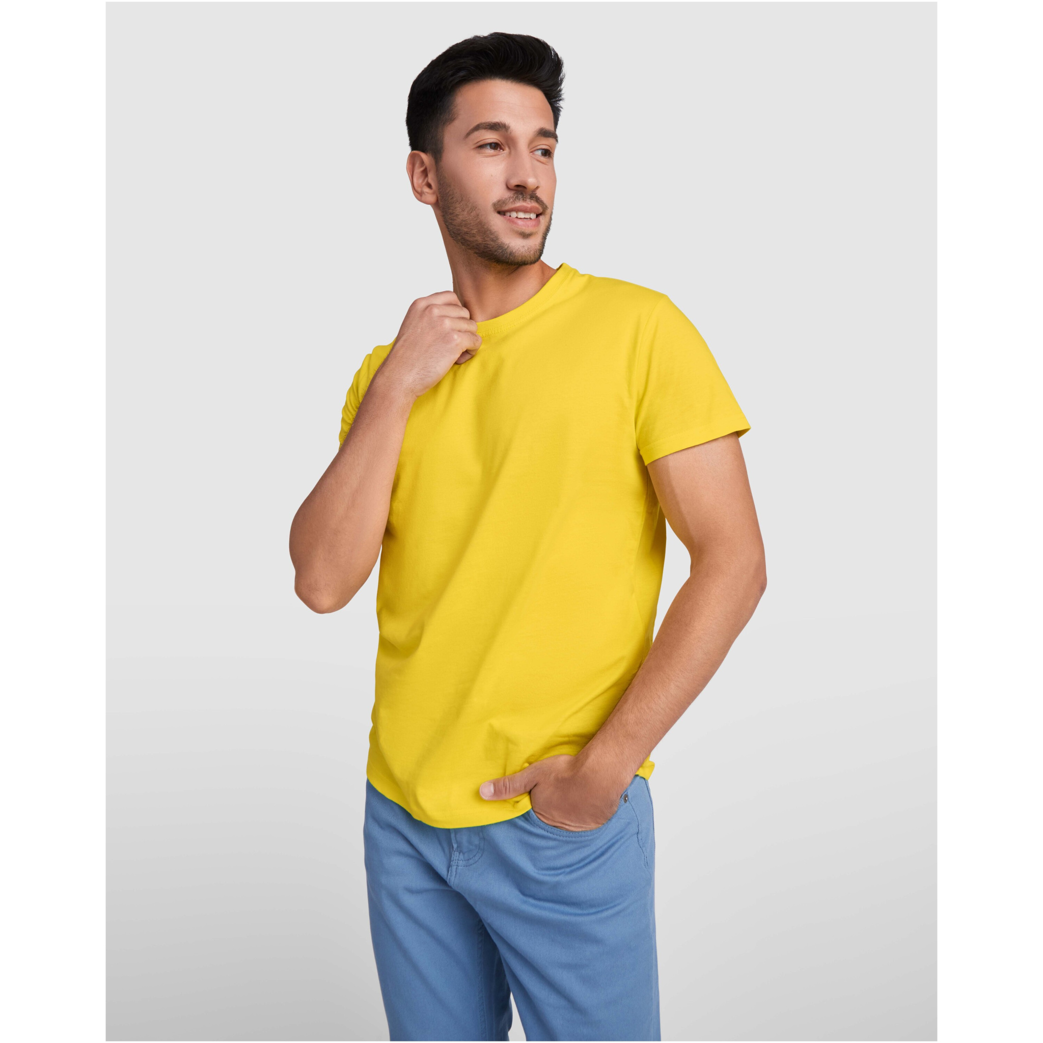 Short-sleeve t-shirt with 4-layer crew neck and reinforced covered seams in collar and shoulders. Side seams. Size 4XL and 5XL only available in certain colours. Removable label.