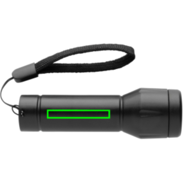 The Flara USB-rechargeable torch is a compact and reliable lighting solution for everyday use. Its matte black body, made from 46% RCS recycled ABS, houses a rechargeable 500 mAh Lithium battery, providing up to 6 hours of operating time and recharging in 1 hour 40 minutes via the included 30 cm black USB-C to USB-C RCS RTPE cable. The torch features a single XPE light with three modes: 100%, 50%, and flashing, producing 80 lumens at 1W. A black polyester carry loop allows for easy portability. The case is made from RCS certified recycled ABS plastic. RCS (Recycled Claim Standard) is a standard to verify the recycled content of a product throughout the whole supply chain. Total recycled content: 46 % based on total item weight. This torch is PVC-free and packaged in an FSC® certified kraft box. | Input current: 5V / 1A.