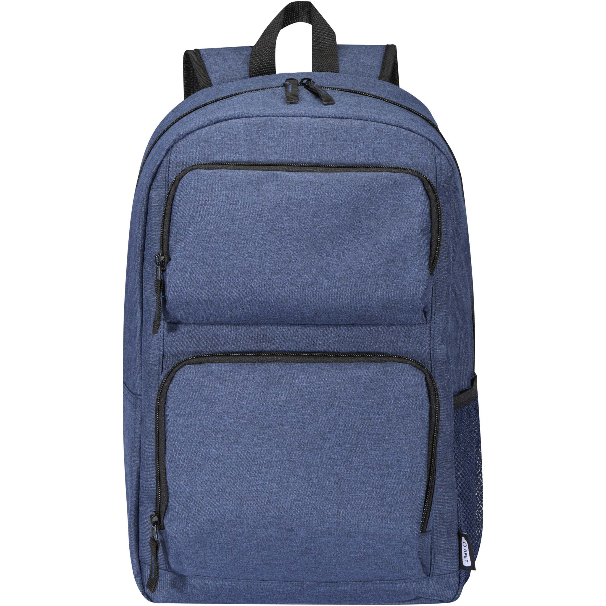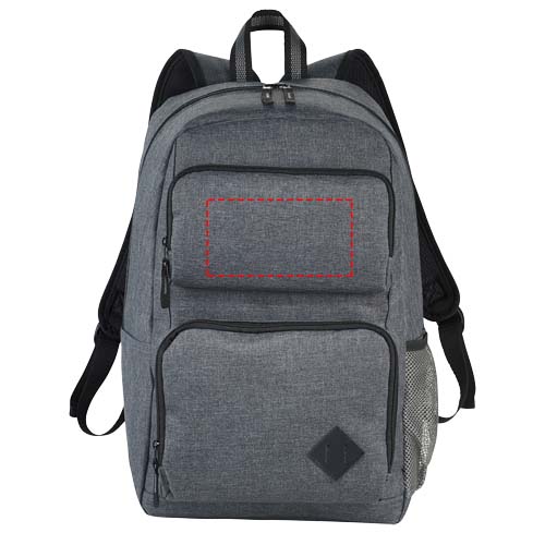 Zipped main compartment with padded laptop sleeve holds up most 15.6" laptops and has a dedicated tablet pocket with room for all your other business essentials. The two front pockets offer flexible decorating locations and are large enough for power banks, cables, and other essentials. The side pocket offers additional storage. Adjustable padded backpack straps and top grab handle. There may be minor variations in the colour of the actual product due to the nature of the fabric dyes, weaves, and printing.