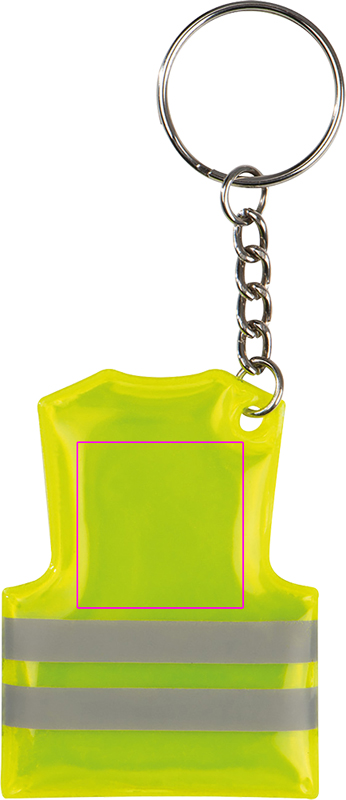 Keyring in the shape of a safety vest with reflective stripes. We print your logo above the stripes.