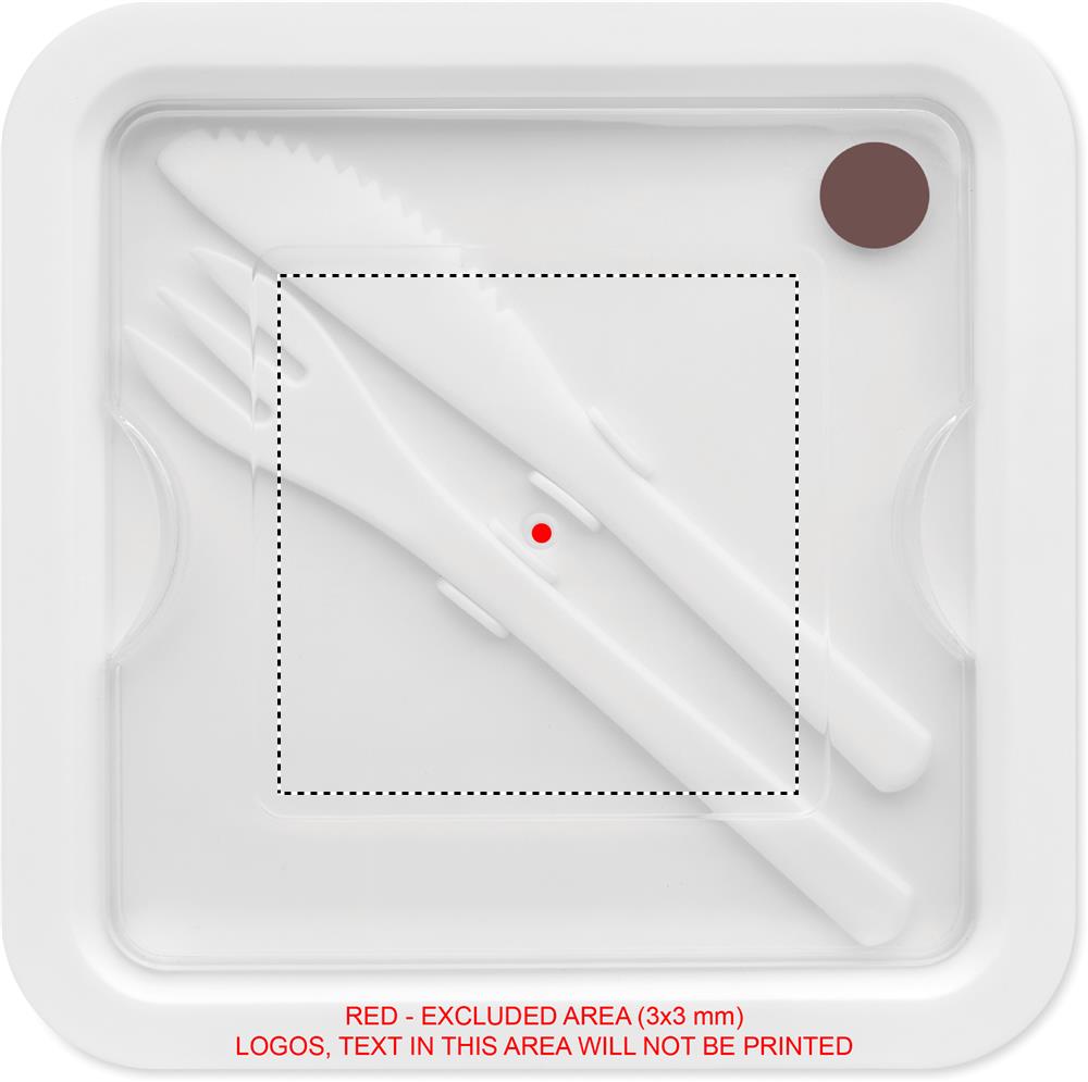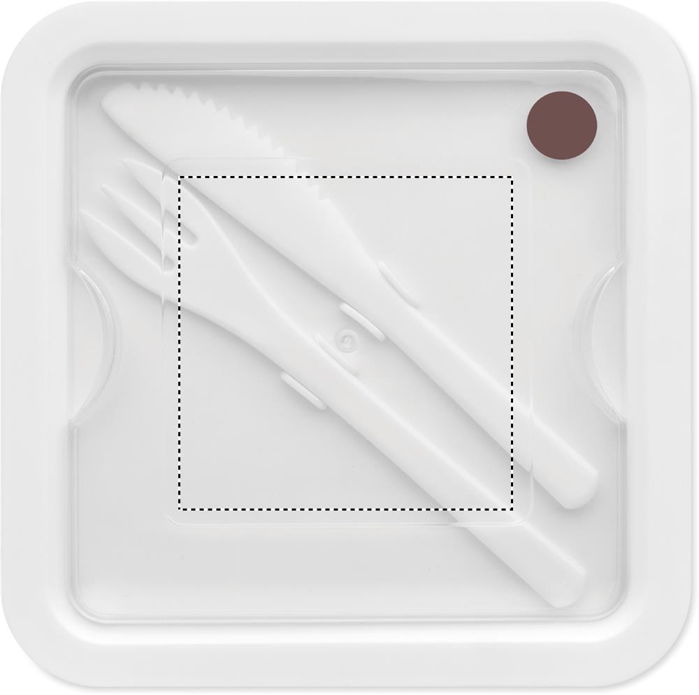 Lunch box in PP with 2 compartments. Includes PP cutlery set in the lid. Capacity: 600 ml.