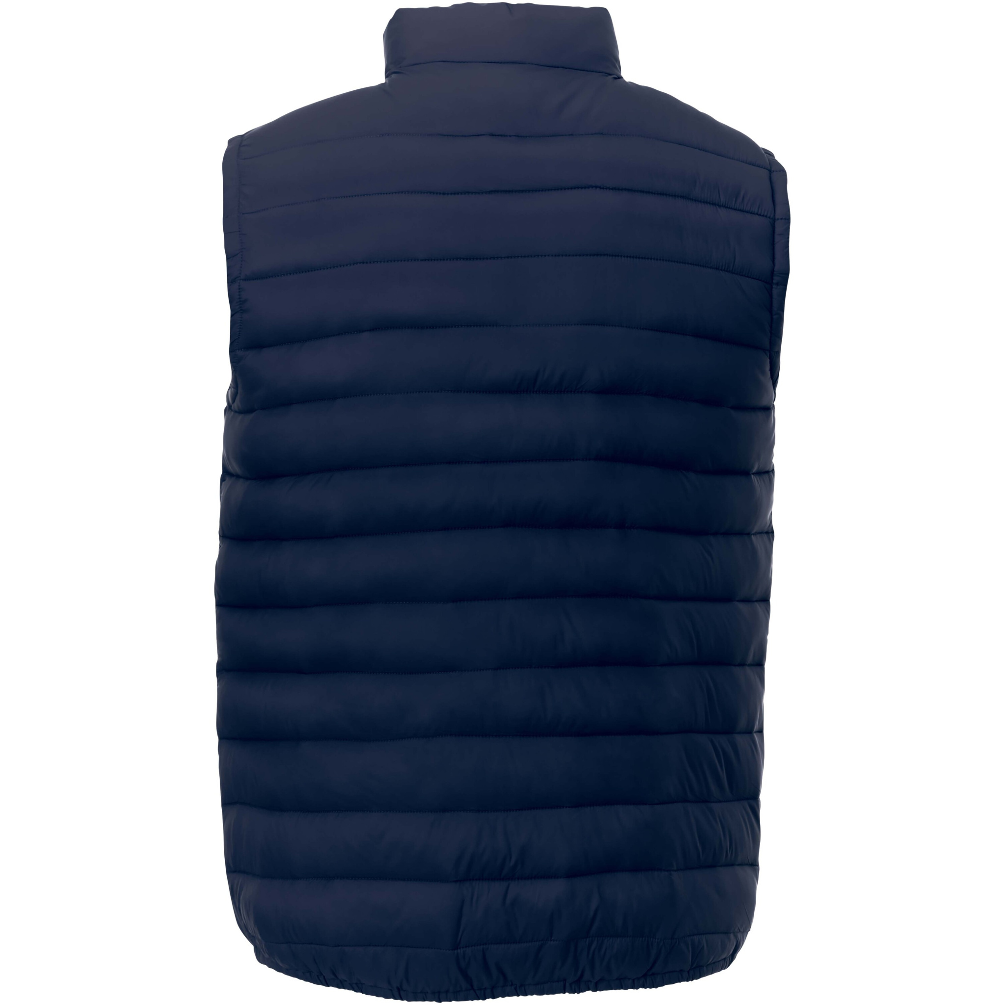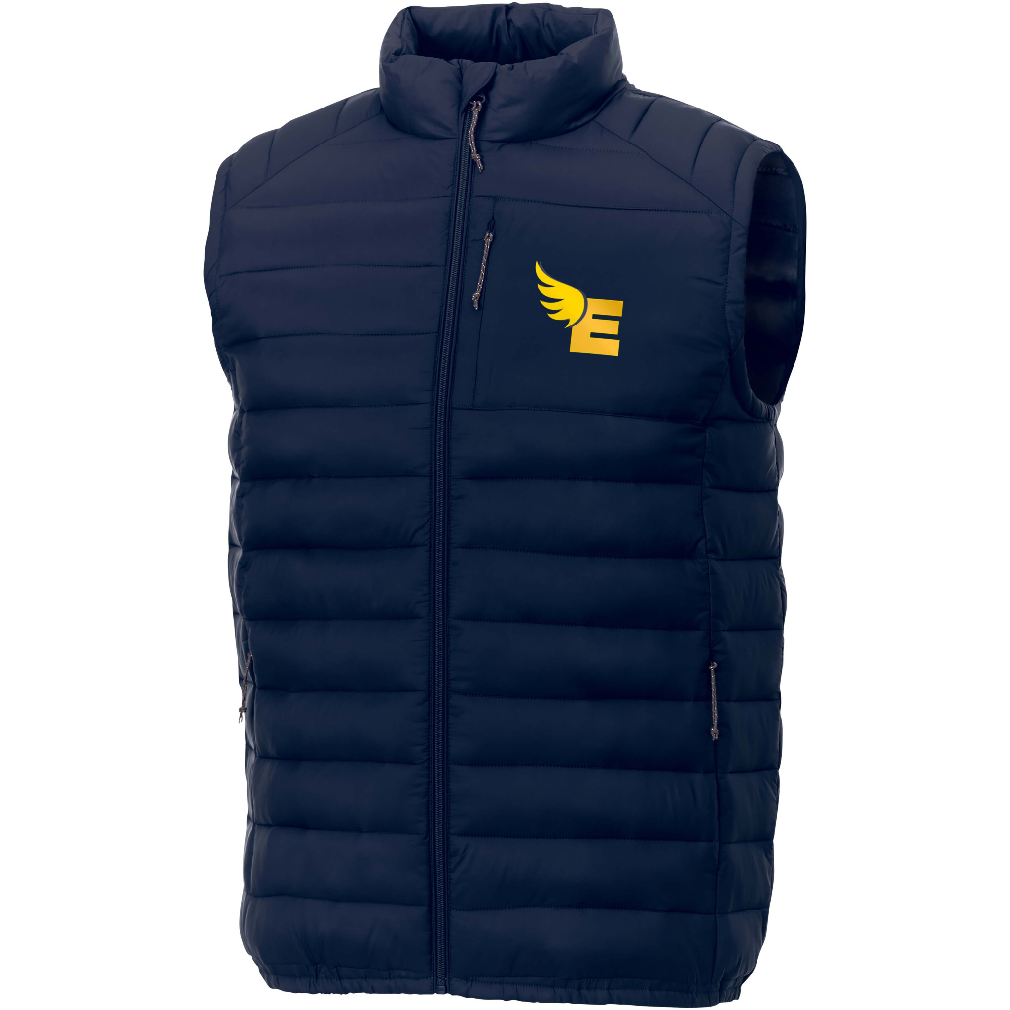 The Pallas men's GRS certified recycled insulated bodywarmer – a perfect blend of style and functionality. Stay protected from cold and wind with the inner stormflap featuring a chinguard. The bodywarmers's chest pocket with zipper closure provides a secure space for your essentials. The elasticated binding adds a stylish touch while ensuring a secure fit. Made of 38 g/m² of dull cire 380T nylon woven fabric, the bodywarmer offers a sleek and durable exterior. The padding and filling consist of fake down insulation made of polyester, providing lightweight warmth without compromising on comfort.