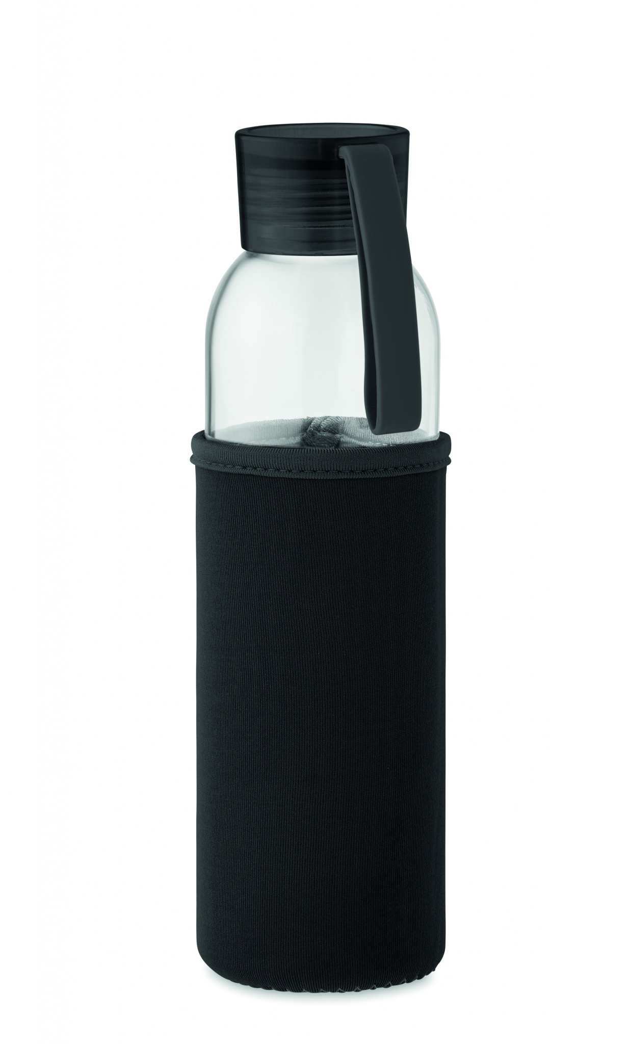 Recycled glass bottle with neoprene pouch and PP lid with silicone hanger. Leak free. Capacity: 500 ml.