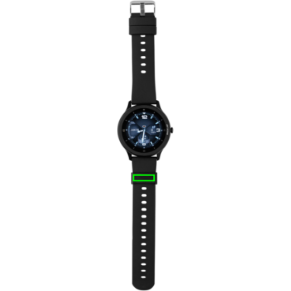 Modern high performance watch with 1.28" round fast responsive full touch screen to track your activities all day long. With high resolution display. Made with RCS (Recycled Claim Standard) certified recycled TPU armband and zinc alloy frame. Total recycled content: 23% based on total item weight. RCS certification ensures a completely certified supply chain of the recycled materials. Features include: Step count, calories, distance, multi-sport (24 types) tracking alarm clock, heart rate tracking, blood pressure monitoring, sleep monitor calendar updates. Notifications: SMS, Facebook, Skype, WhatsApp, Twitter etc. Compatible with Android 4.4 and IOS 8.0 and above. IPX 68 water and dustproof. BT 5.0. Standby time of 25 days and working time up to 7 days. Including clip charger to charge the watch. Packed in FSC® mix kraft packaging. Item and accessories 100% PVC free.