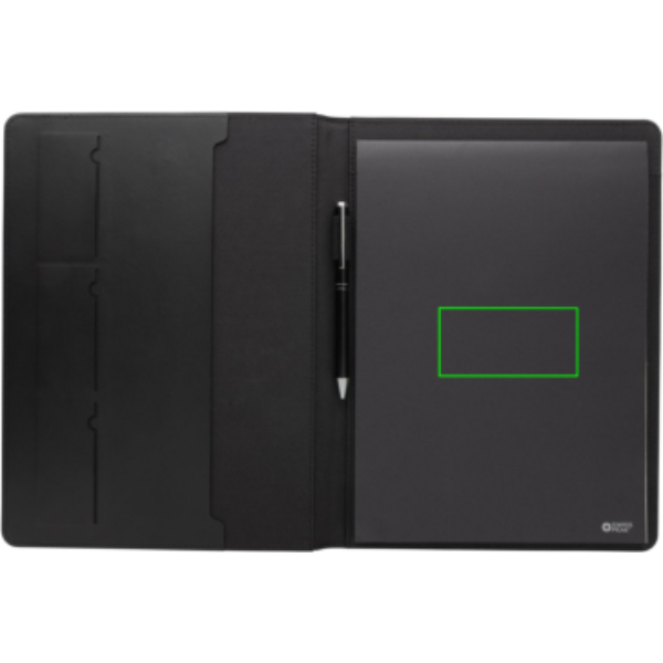 Crafted from 100% AWARE 300D recycled polyester and RCS certified recycled PU, this portfolio blends style and low impact. It features business card slots, pen loop, and a spacious A4 pocket. Stay organized with the refillable A4 lined notepad (20 pages 70 gsm) made from FSC® mix cream paper. Experience sophistication with a conscience. Made with 100% recycled polyester embedded with the AWARE™ tracer. Packed in an FSC® gift box.