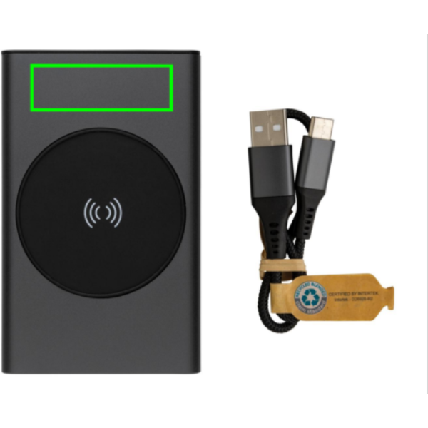 Powerbank made with RCS (Recycled Claim Standard) certified recycled aluminium and ABS. Total recycled content: 31 % based on total item weight. RCS certification ensures a completely certified supply chain of the recycled materials. Aluminium does not lose its characteristics in the recycling process and can be recycled endlessly. The powerbank contains a long-lasting grade A 5000 mAh lithium polymer battery. The wireless charger supports wireless charging up to 5W. The power indicators will indicate the remaining energy level so you always know when to re-charge. Item and accessories 100% PVC free. Including type C charging cable made from RCS certified recycled aluminium, TPE and PET. Packed in FSC® mix packaging. USB output 5/2.4A, Type C output: 5V/2.4A. Type C input: 2.4A. Micro USB input: 5V/2A.