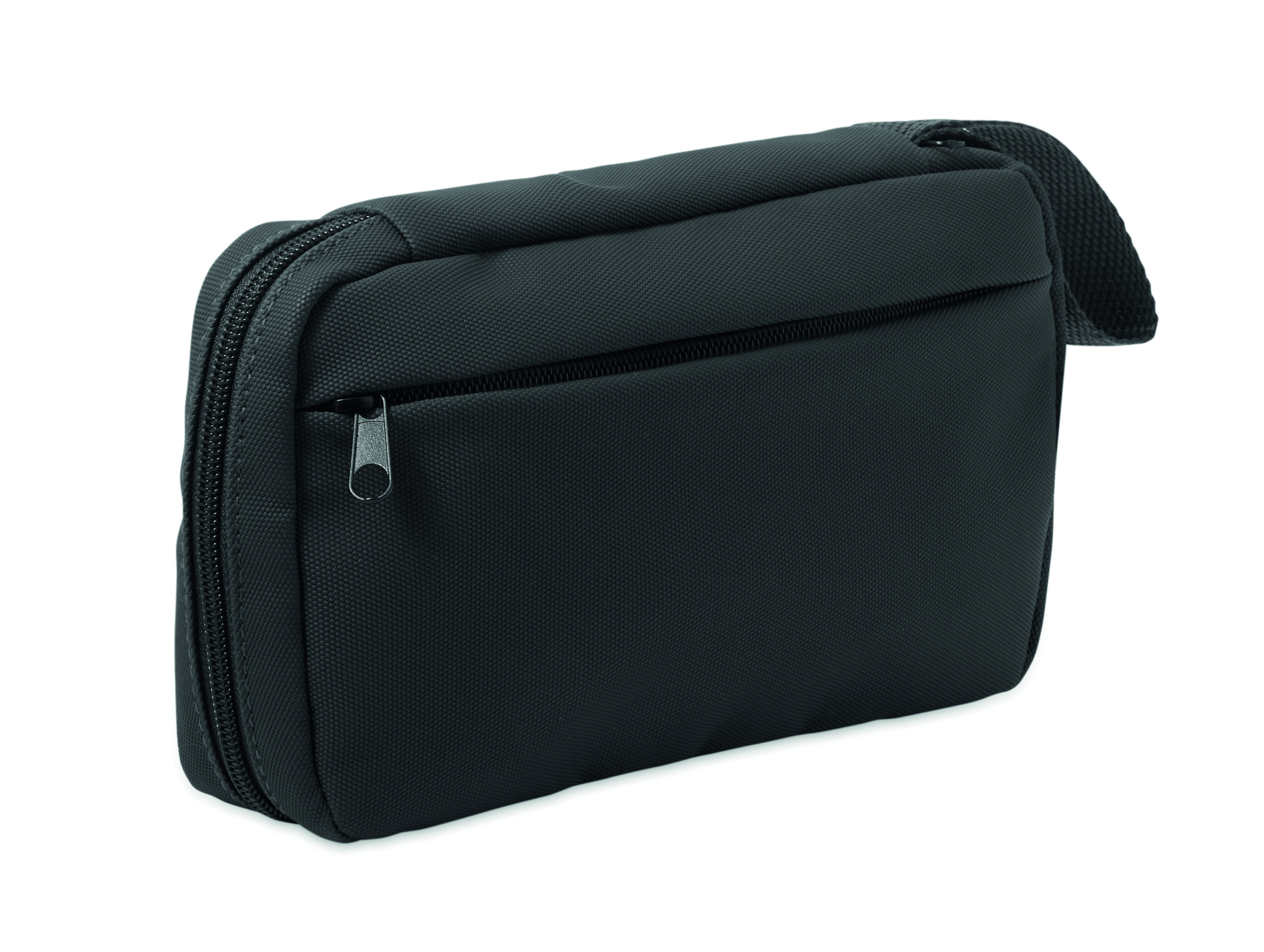 Toiletry bag in 600D RPET with PU coating, RPET mesh and 210D RPET lining. Features front zippered main compartment pocket, inner mesh and open pockets.