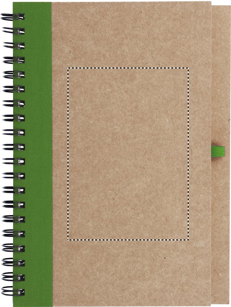 Taaskasutatud paberist märkmik koos sobiva pliiatsiga. Kahejuhtmeline. 140 tavalist taaskasutatud paberilehte (70 lehte). Sobiv nupuga pastapliiats taaskasutatud karbis ja biolagunevas plastis. Sinine tint. Sobiv elastne pliiatsihoidja.
