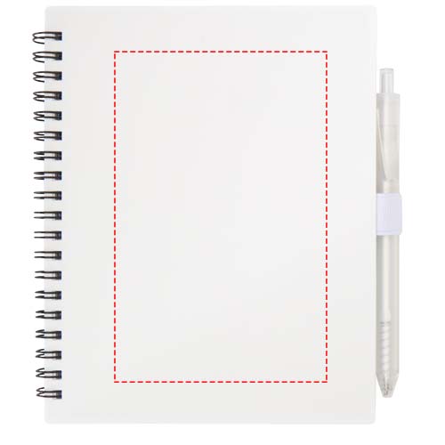 Niove pehmekaaneline märkmik on valmistatud taaskasutatud plastist ja sisaldab 70 punktiirjoontega lehte (70 g/m² paberit). Märkmikul on pliiatsiaas. Märkmiku suurus: 140 x 178 mm. Pastapliiats on samuti valmistatud taaskasutatud plastist. Tindi värv: sinine. Kirjutuspikkus: 1000 meetrit. Otsa suurus: 1,0 mm.