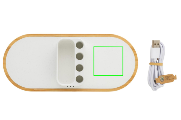 Kahekordne 10 W kiire juhtmevaba laadija koos pliiatsihoidjaga, mis on valmistatud RCS (Recycled Claim Standard) sertifitseeritud taaskasutatud ABS-ist. Taaskasutatud kogusisaldus: 31% eseme kogukaalust. RCS-sertifikaat tagab taaskasutatud materjalide täielikult sertifitseeritud tarneahela. Põhi on valmistatud FSC® 100% bambusest. Juhtmeta laadimine ühildub Androidi uusimate põlvkondade, iPhone 8 ja uuemate versioonidega. Saab laadida kahte telefoni korraga või laadida mis tahes muud juhtmevaba seadet. 4 pliiatsiauguga pliiatsite/pliiatsite hoidmiseks ja väikese hoiukohaga visiitkaartide või muude väikeste esemete hoidmiseks. Toode ja tarvikud PVC-vaba. Kaasa arvatud 120 cm C-tüüpi laadimiskaabel, mis on valmistatud RCS-sertifikaadiga taaskasutatud TPE-st. Pakitud FSC®mix kraftkarpi. Type-C in; Sisend 5V/2A; 9V/2A; Juhtmeta väljund 5V/1A;9V/1,1A; (10W) Registreeritud disain®