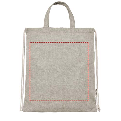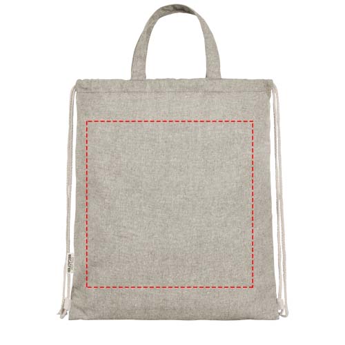 Pingutusnööriga kott on valmistatud 150 g/m² taaskasutatud puuvillasest polüestri segust. Suur põhisahtel naturaalset värvi puuvillase nööriga. Taaskasutatud puuvilla toodetakse tarbimiseelsetest jäätmetest, mis tekivad tekstiilitehastes lõikamisprotsessi käigus. Sarnased värvid segatakse kokku, nii et täiendavat värvimist pole vaja. Taaskasutatud puuvilla olemuse tõttu võib esineda väga väikest värvimuutust. See lisab selgelt autentsema välimuse. Iga seljakotiga on kaasas ka Aware™ jälgija. See uuenduslik funktsioon võimaldab kasutajatel QR-koodi abil jälgida oma kauba päritolu ja teekonda, suurendades tarneahela läbipaistvust ning soodustades tugevamat seost toote ja selle tootmisprotsessi vahel. Vastupidavus kuni 5 kg kaalule. Käepideme pikkus: 14 cm.