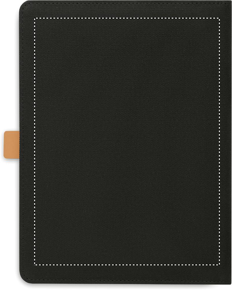 A5-salkku RPET-materiaalista, keinonahkaisilla yksityiskohdilla. A5-muistikirja, jossa on kovakorkkikansi. 128 viivoitettua sivua kierrätyspaperista (64 arkkia). Kynänpidike. 2 korttipidikettä ja yksi iso lokero. Joustava sulkuhihna, jossa metalliset yksityiskohdat.