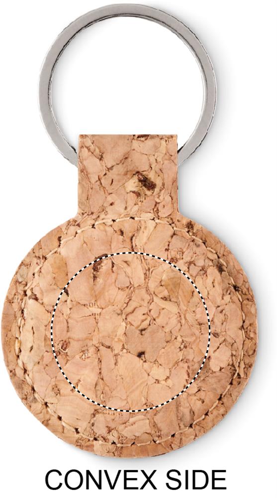 Pyöreä korkista tehty avaimenperä. Korkki on luonnonmateriaali, strukturaalinen laatu ja pinnan huokoisuus voi aiheuttaa eroavaisuuksia tuotteissa painatuksen jälkeen.