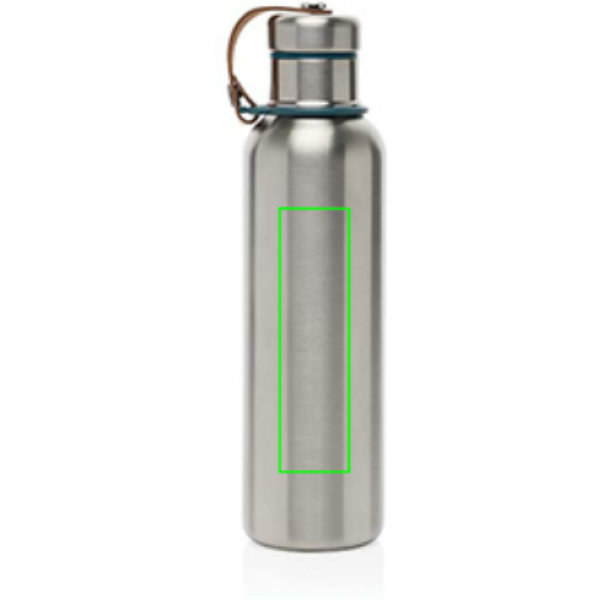 Ruostumattomasta teräksestä valmistettu vesipullo on tyylikäs tyhjiösuljettu pullo, joka pitää juomat kylmänä 24 tuntia tai kuumana 12 tuntia. Myös kansi on täysin ruostumatonta terästä, joten vesi ei pääse kosketuksiin muovin kanssa. Keinonahkainen kantolenkki toimii viehättävänä muotoilun yksityiskohtana. Vain käsipesu