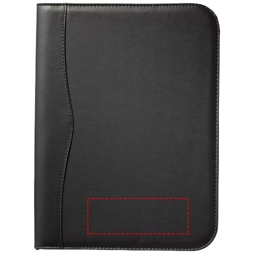 A4-kokoisessa Ebony -kansioissa on kätevä lokero sekä vetoketjutasku asiakirjojen säilyttämistä varten. Tämän lisäksi siinä on 20-sivuinen viivallinen muistilehtiö sekä kynälenkki (kynä ja tarvikkeet eivät sisälly toimitukseen). Sulje kansio vetoketjulla, jotta sisältö pysyy siistinä ja hyvin suojattuna. Salkku on valmistettu kestävästä keinonahasta, ja siinä on runsaasti tilaa suurille logoille.