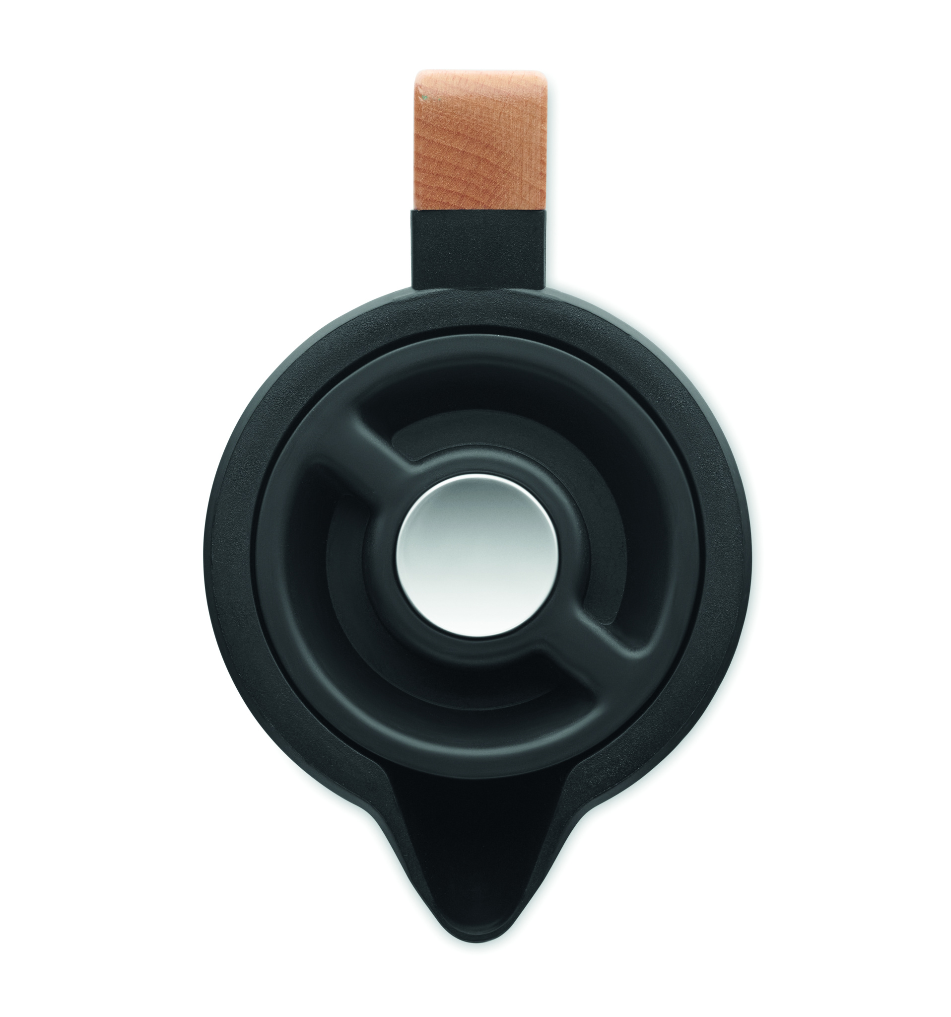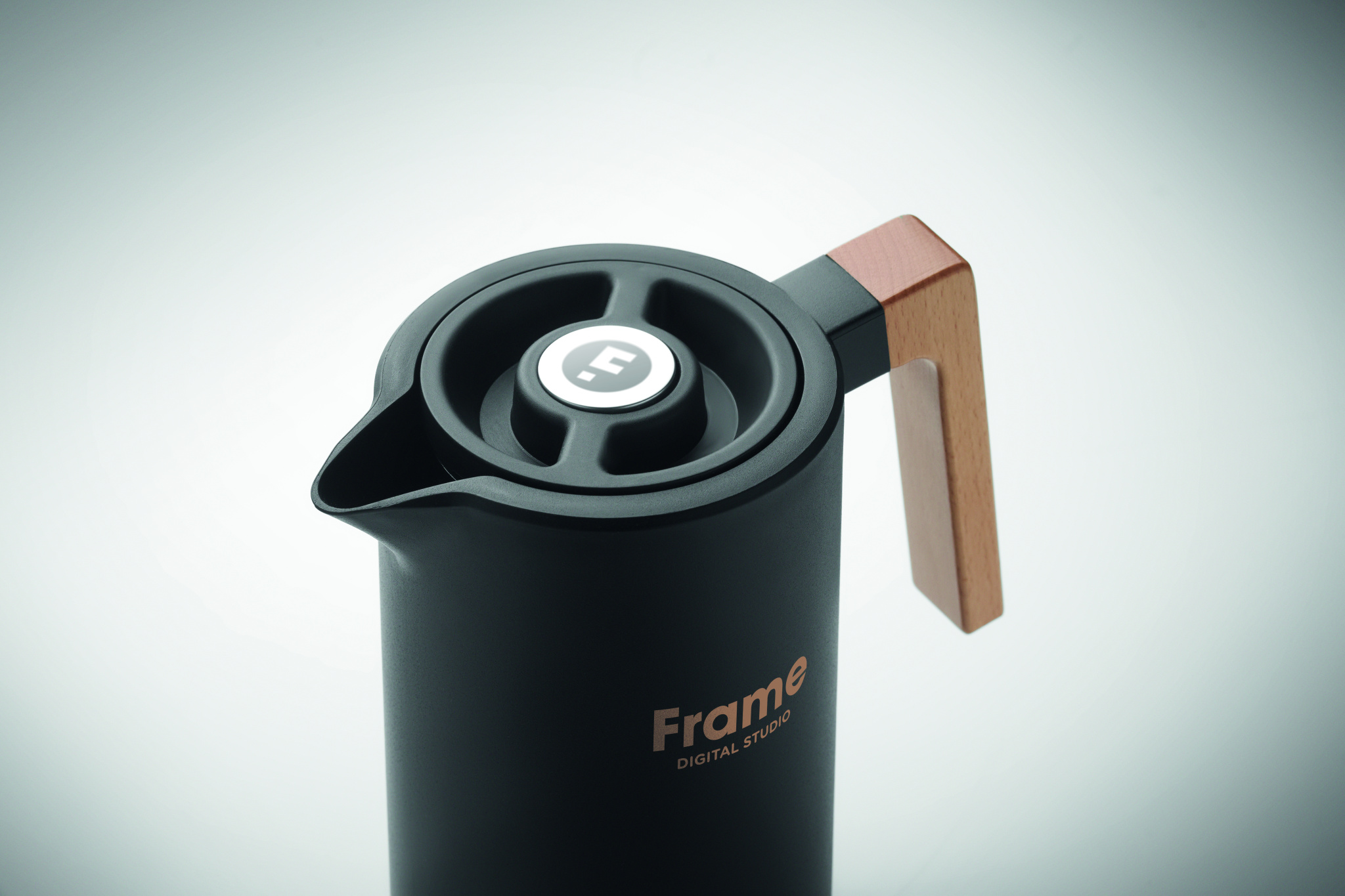 Kaksinkertainen eristetty termoskannu kierrätetystä ruostumattomasta teräksestä (90 % kierrätettyä ruostumatonta terästä ja 10 % ruostumatonta terästä) ja ulkoseinä PP:tä, puinen kahva. Tilavuus: 1 l.