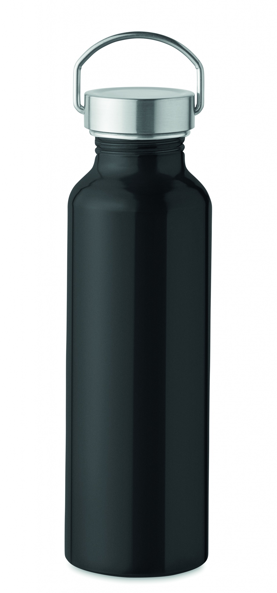 Kierrätysalumiini pullo, jossa on ruostumattomasta teräksestä valmistettu kahvallinen korkki mukautettavalla painatuksella, Musta
