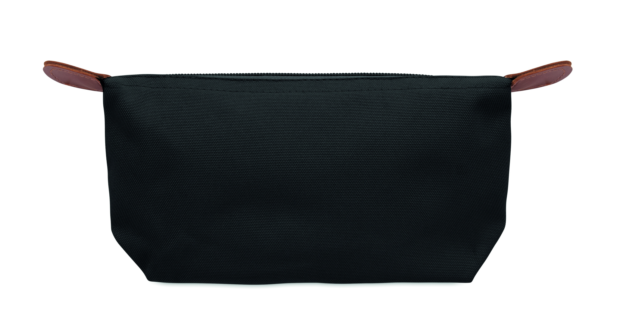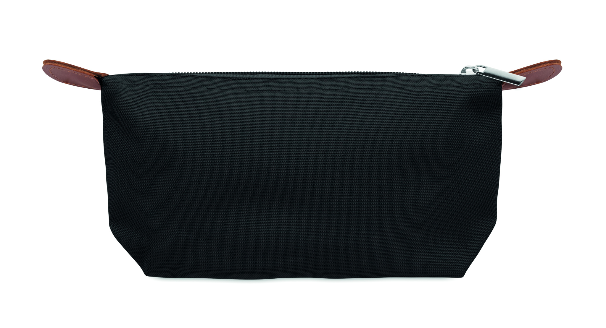 600D RPET-polyesteriä oleva kosmetiikkalaukku, jossa vetoketjukiinnitys ja ruskeat PU-yksityiskohdat.