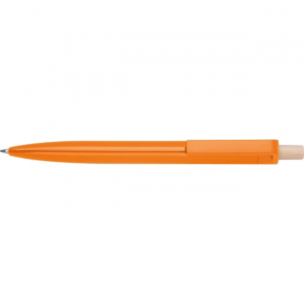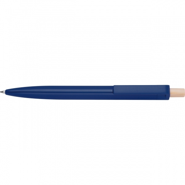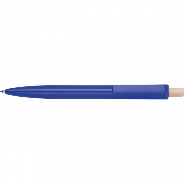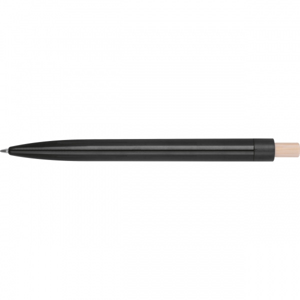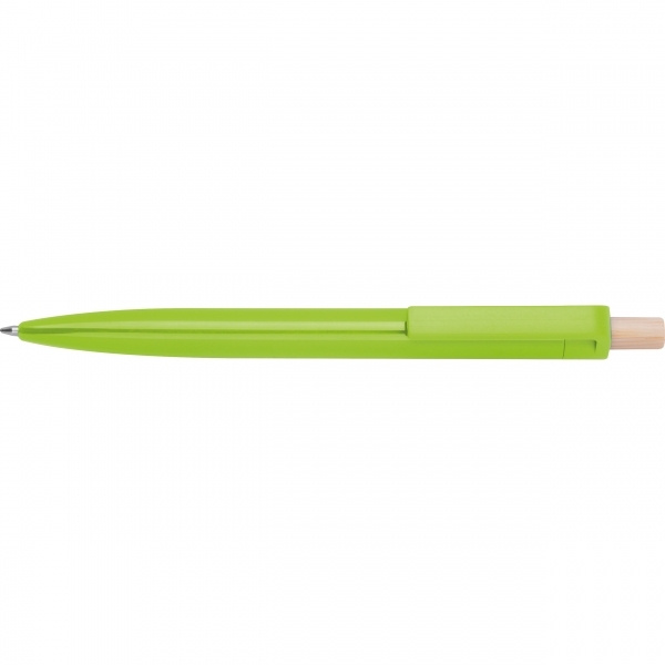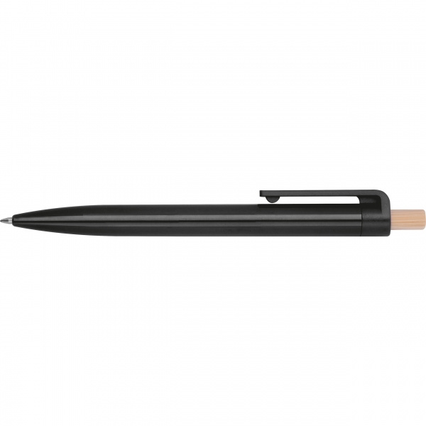 Kierrätetystä ABS-muovista valmistettu kuulakärkikynä, jossa on bambuinen painike. Siinä on sinisellä kirjoitettava muovinen täyttöpakkaus. Logosi on painettu rungon päälle klipsin alle.
