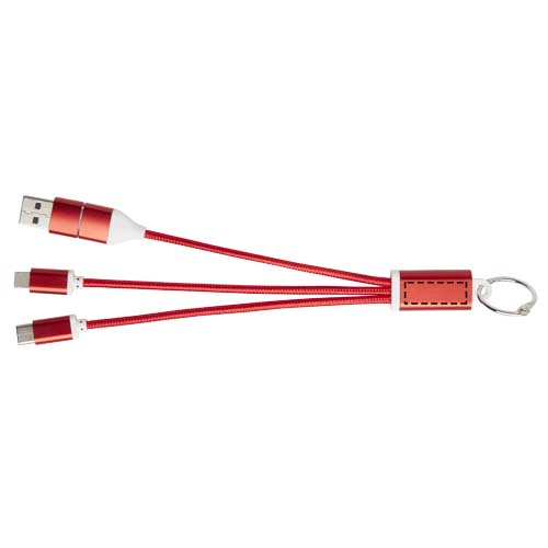 Kierrätetystä alumiinista valmistettu 4-in-1-avaimenperä-latauskaapeli, teho enintään 10 W. USB-A- ja Type-C-tuloliittimien sekä Type-C- ja Lightning/Micro USB -yhdistelmälähtöliittimien ansiosta (tukee Applen iOS- ja Android-laitteita) voit ladata useimpia älypuhelimia, kameroita, varavirtalähteitä ja kuulokkeita.