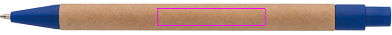 Kierrätyspaperista ja värillisistä muovisovelluksista valmistettu kuulakärkikynä, sininen kirjoitus. Logosi on painettu leikkeen oikealle puolelle.