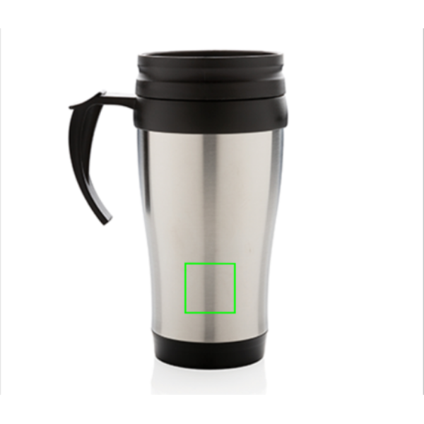 350 ml muki, ulkopuoli ruostumatonta terästä, sisäpuoli PP, mustat kansi ja pohja.