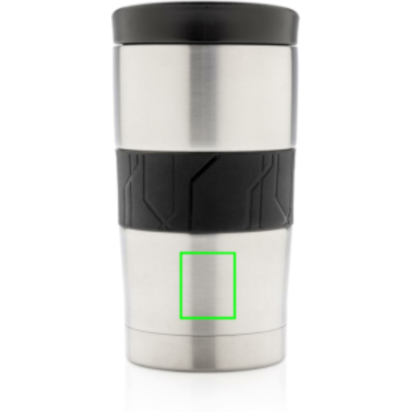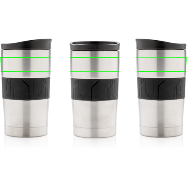 Tiivis, tyhjiöeristetty muki on valmistettu kaksiseinäisestä, ruostumattomasta teräksestä, ja siinä on silikonikahva ja liukukansi. Voidaan pestä astianpesukoneessa ja sopii useimpiin kahviautomaatteihin. Sisältö: 300 ml.