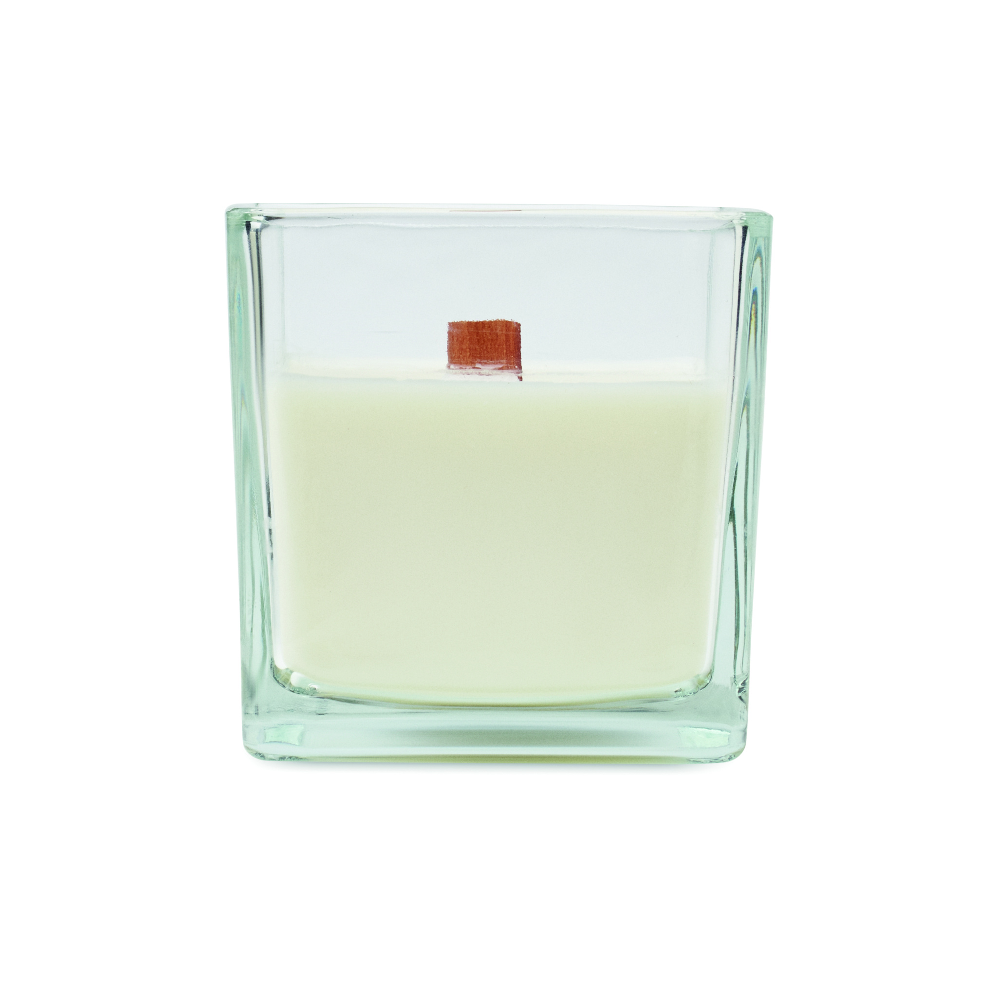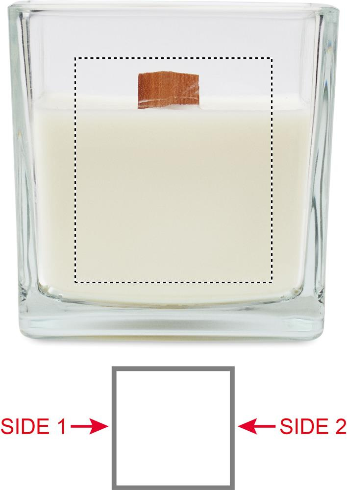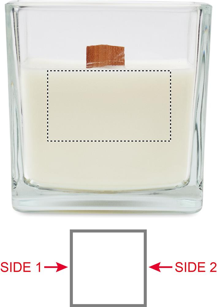 Suuri vaniljan tuoksuinen kasvipohjainen vahakynttilä, 600 g, lasissa, puisella sydämellä ja mehiläispesäkuviolla. Paloaika 65 tuntia.
