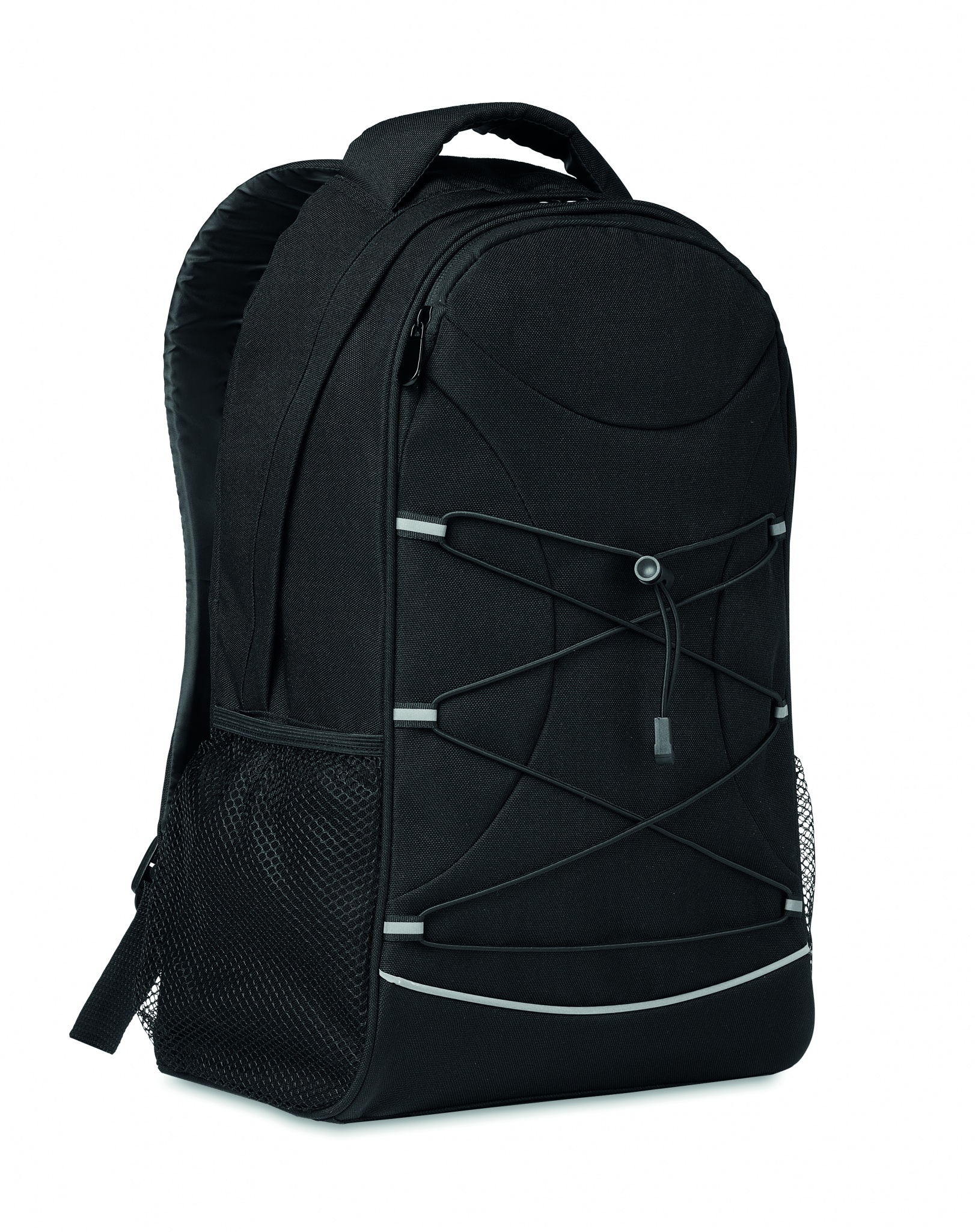 600D RPET kuprinė su tamsiais virveliais priekyje ir atspindinčia priekinio skydelio funkcija. Abiejose pusėse tinklinės kišenės.