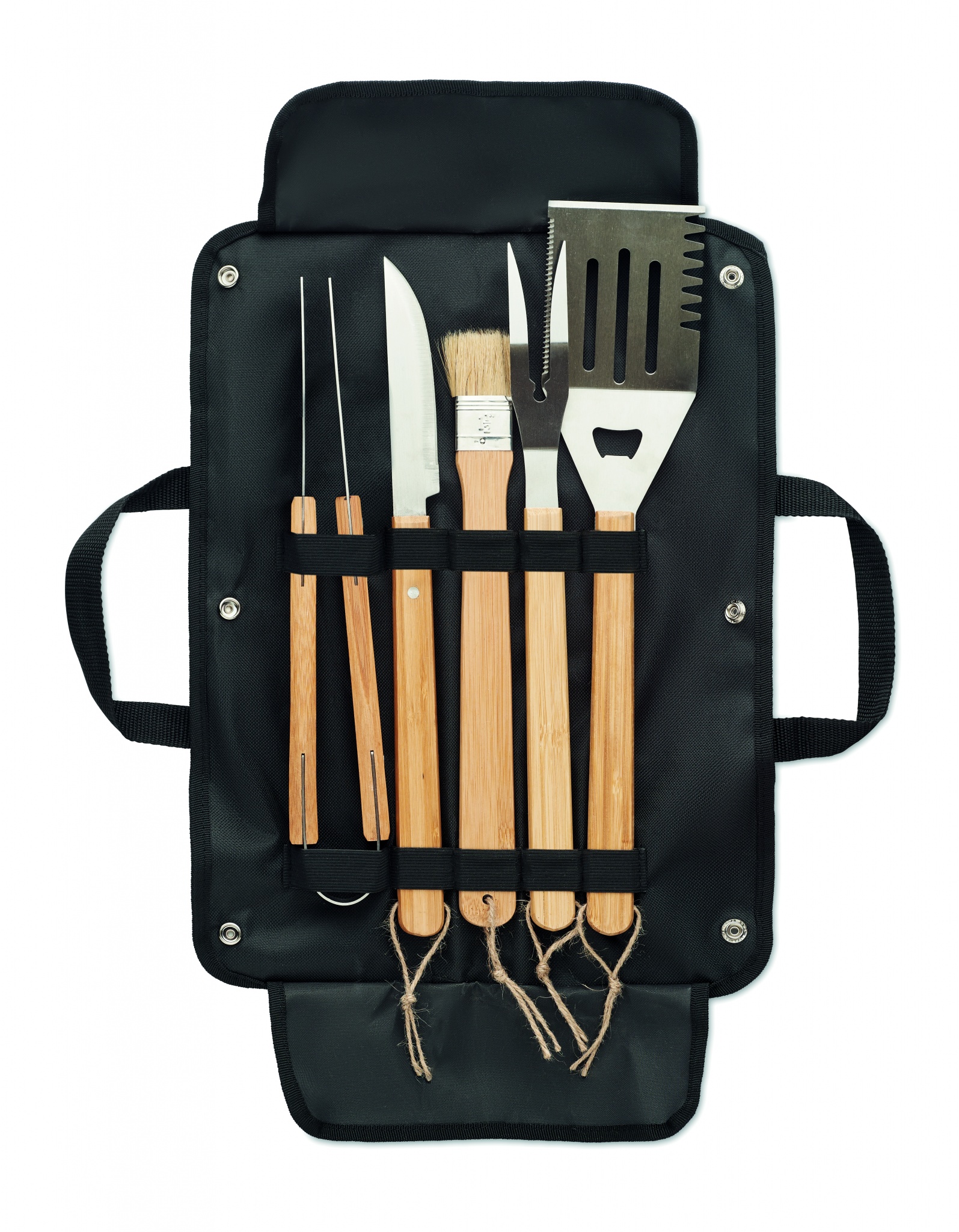 5-daļīgs bārbekjū nerūsējošā tērauda instrumentu komplekts ar koka rokturi un vaskota audekla maisiņu. Ietver lāpstiņu, nazi, knaibles, dakšiņu un birstīti.