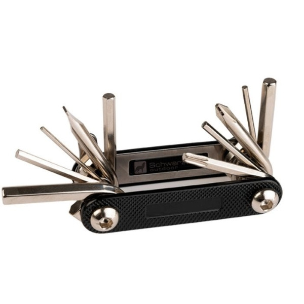 Praktisks instrumentu komplekts velobraucējiem. Ietver velosipēdu remonta daudzfunkciju rīku un cilpu. Iepakots Schwarzwolf kastē.