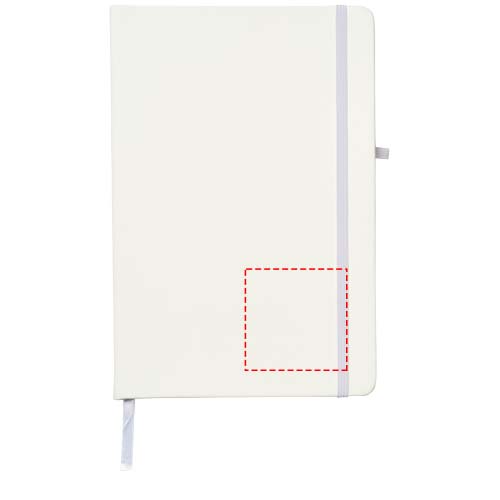 A5 reference size notebook with a matching colour elastic closure, pen loop, and ribbon. Includes 96 sheets of 70g/m2 lined paper. Soft feel PU cover.