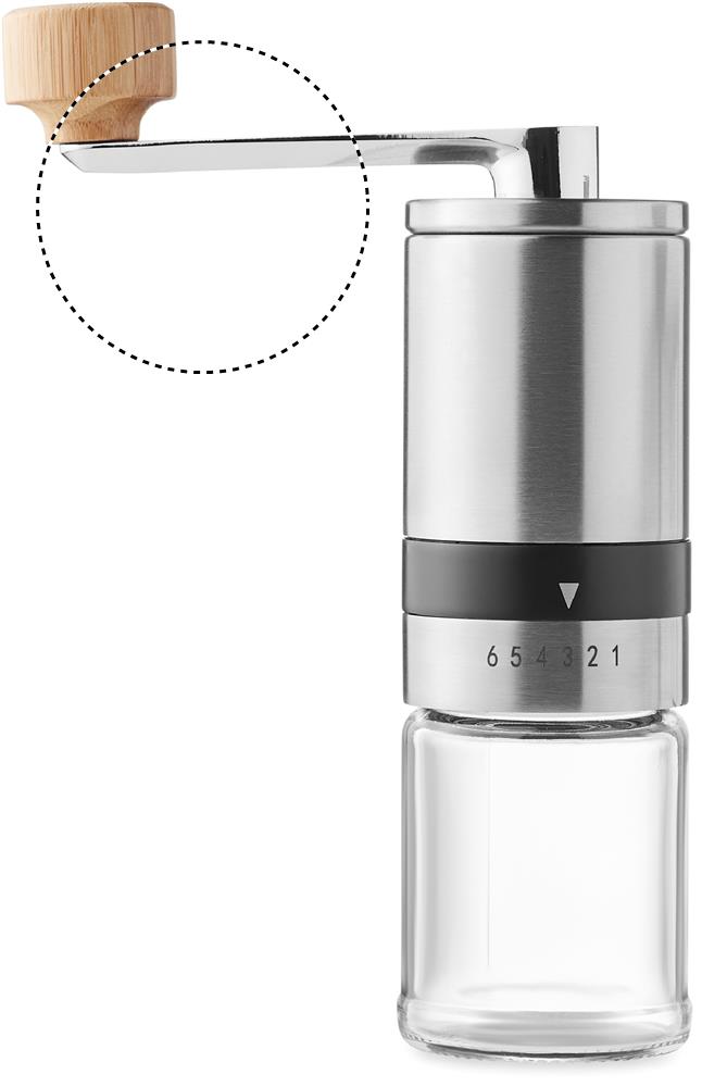 Кофейный набор. Включает кофейник из стекла и нержавеющей стали и ручную керамическую кофемолку с бамбуковой отделкой. Объем: кофейник 350 мл, кофемолка 100 мл.