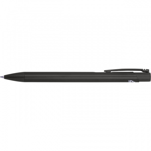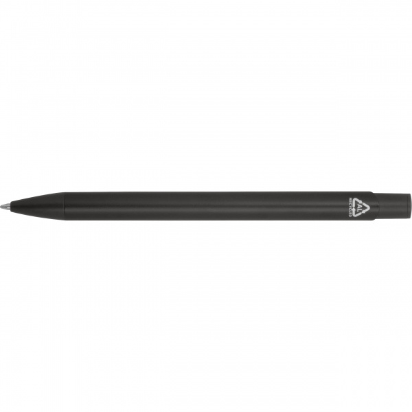 Полноцветная шариковая ручка из переработанного алюминия с синим стержнем увеличенной ёмкости. Ваш логотип наносится под зажимом с помощью лазерной гравировки.