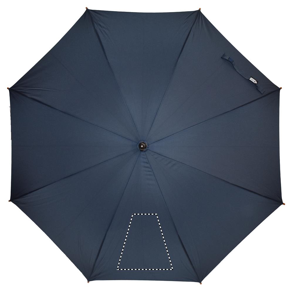 Promenadparaply, 23 tum. Med automatisk öppning. Exklusivt Pongee material i 190T återvunnen RPET. Skaft, sprötspetsar och topp i trämaterial. Svartpläterade metallribbor. Böjt naturligt trähandtag. Manuell stängning.