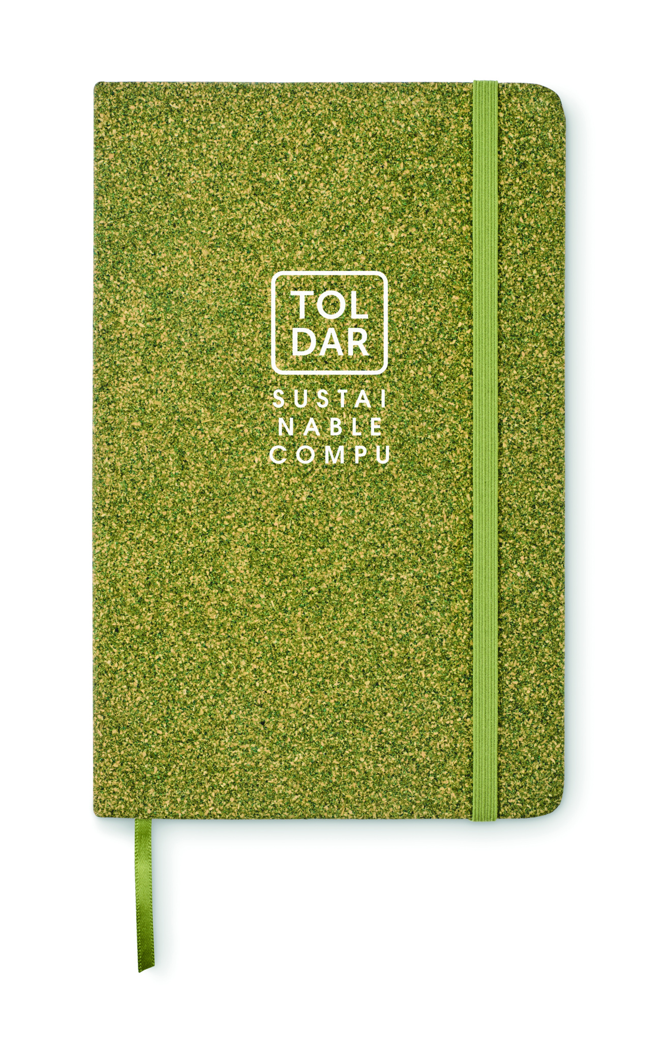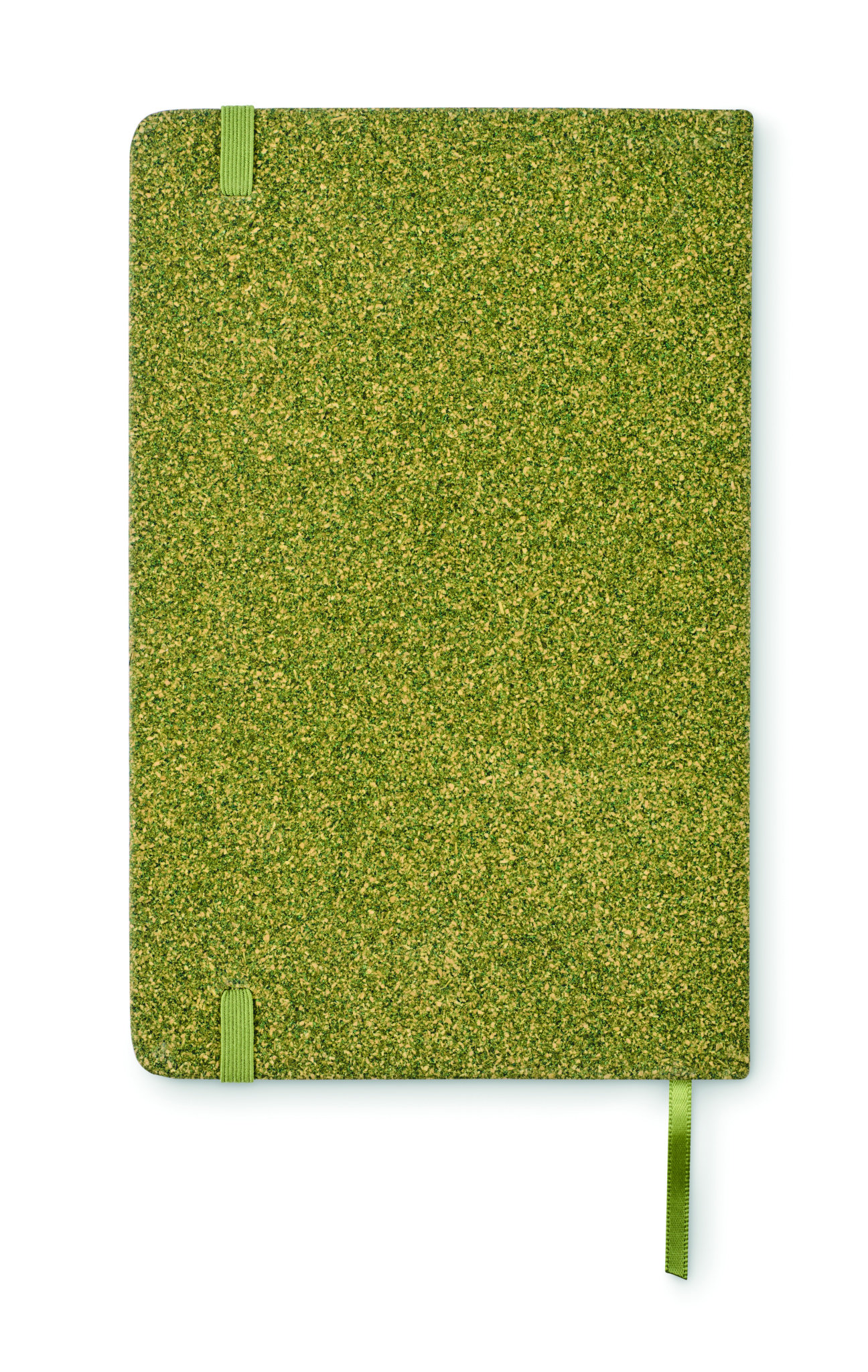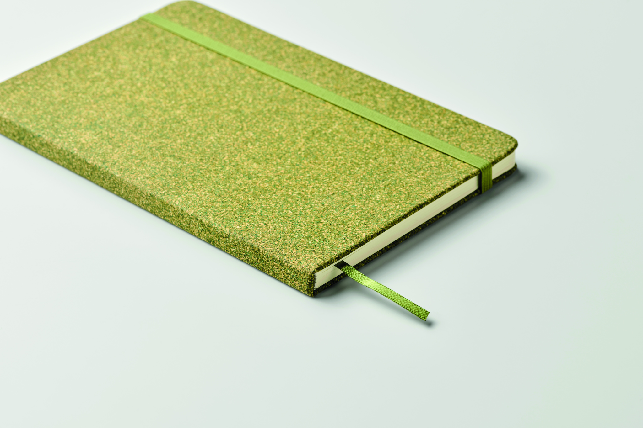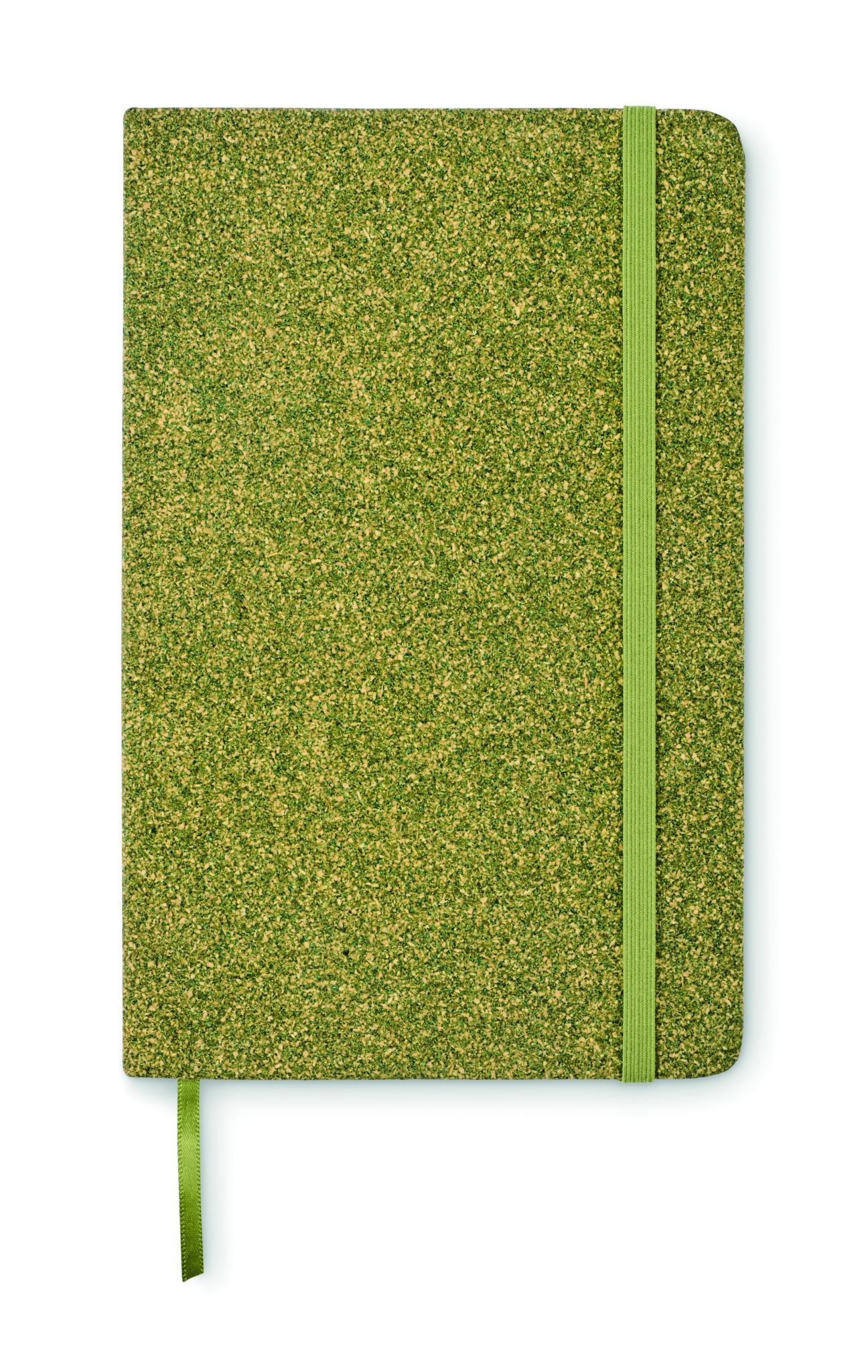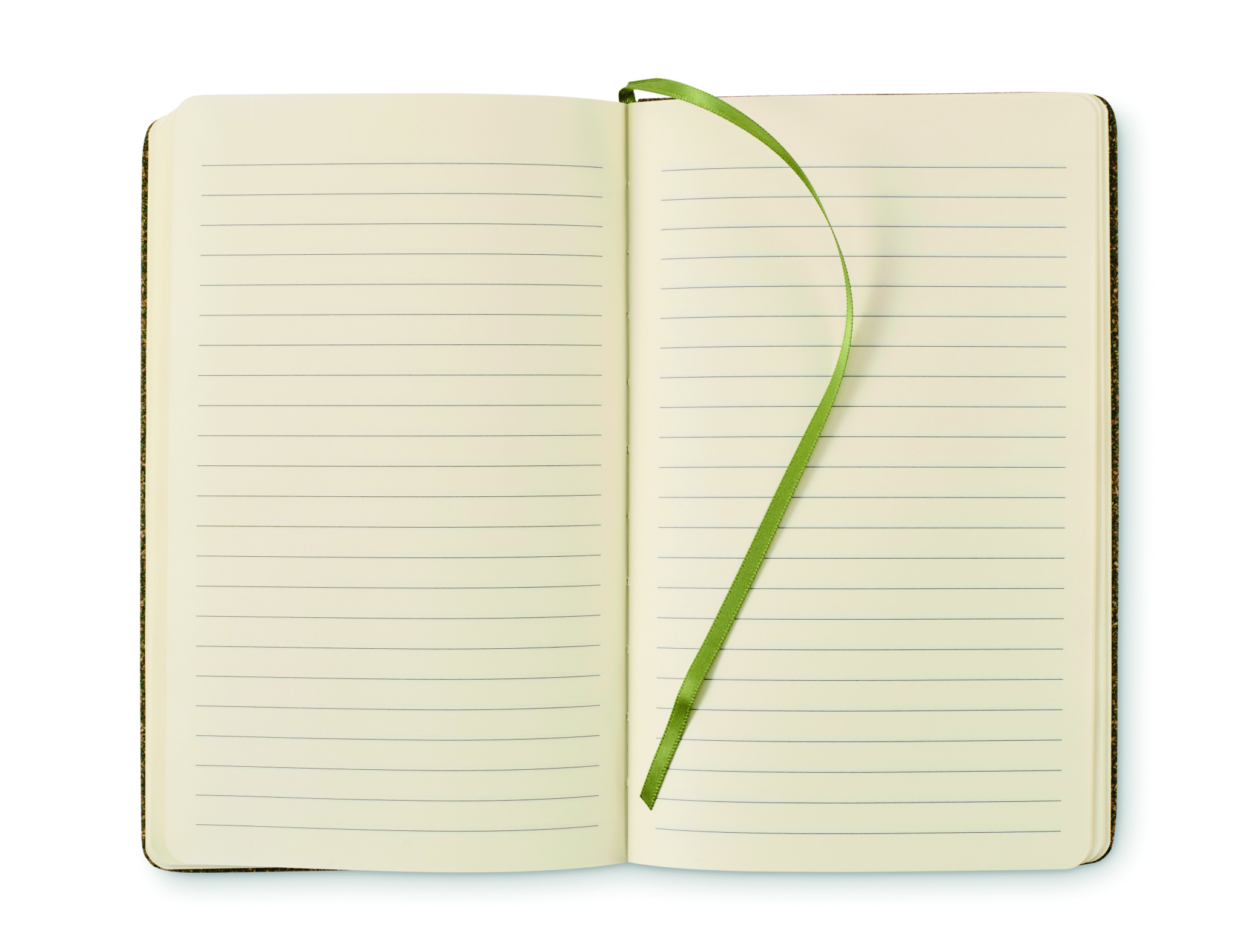 A5 anteckningsbok med hårt omslag tillverkat av 20% tesump, 30% kork och 50% polycottonväv. Inbunden, 160 linjerade sidor av återvunnet papper (80 ark/70 gsm). Matchande elastisk förslutningsband och sidmarkering i band. FSC®-certified | FSC MIX CREDIT, N7.1, FSC-C213206