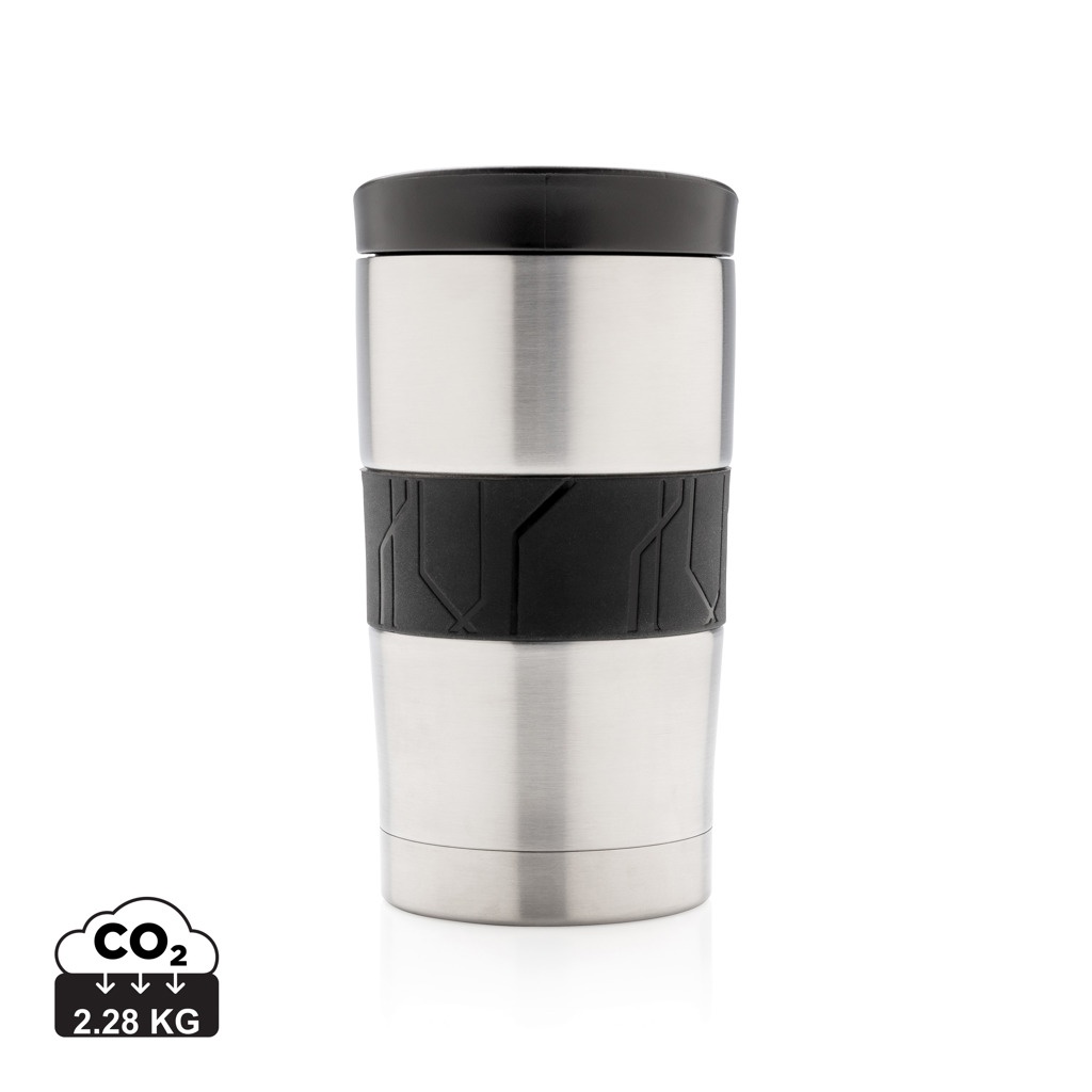 Läckagesäker vakuumisolerad mugg i dubbelväggig 304 stainless steel med silikongrepp och skjutlock. Kan diskas i maskin och passar i de flesta kaffemaskiner. Praktisk enhandsanvändning. Volym: 300ml.