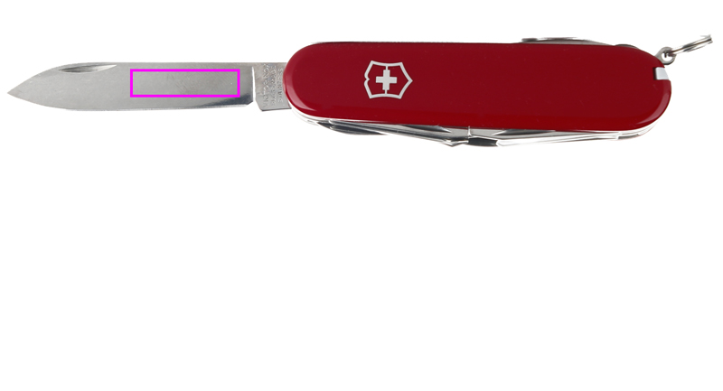 Funktioner: 1. Stort blad 2. Litet blad 3. Korkskruv 4. Burköppnare 5. Liten skruvmejsel (3 mm) 6. Locklyftare 7. Skruvdykare (6 mm) 8. Trådborttagare 9. Brotsch 10. Nyckelring 11. Pincett 12. Tandpetare
