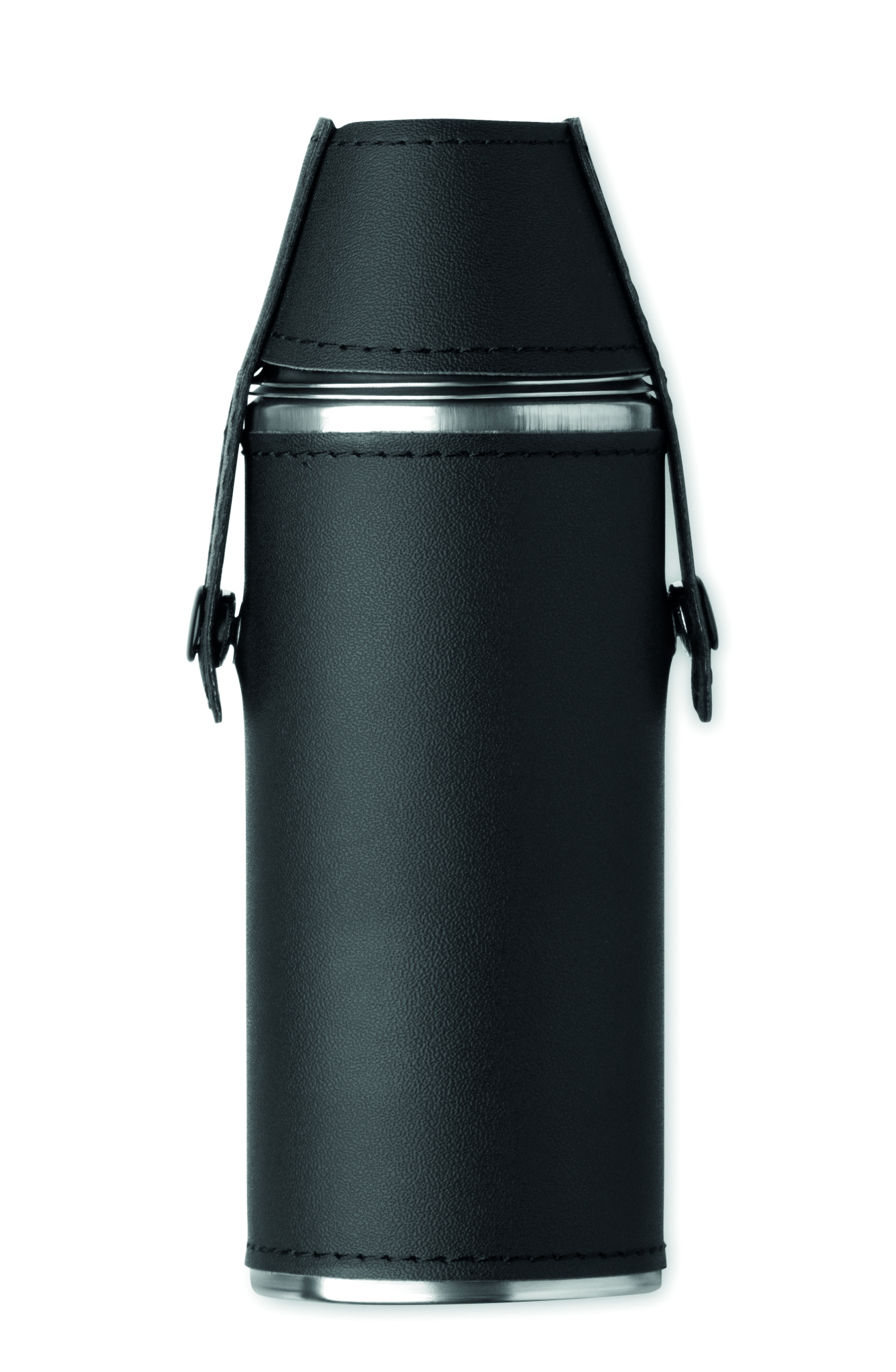 Plunta flaska i rostfritt stål med PU-läderyta och 2 st 20ml shotskoppar i rostfritt stål i locket. Volym: 230ml.