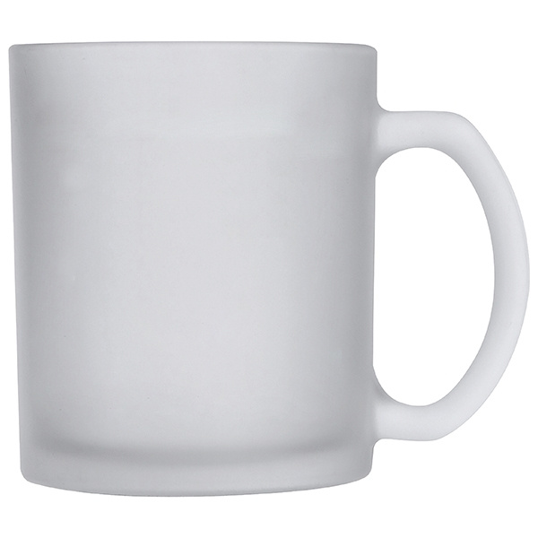 Denna kaffemugg i glas pryder alla skrivbord. Trendig transparent frostad design och dess kapacitet på ca. 300 ml gör att den blir din favoritmugg. Vi trycker din logotyp med hjälp av keramisk transfer till vänster eller höger om handtaget. Vi rekommenderar handtvätt endast för tryckta muggar.