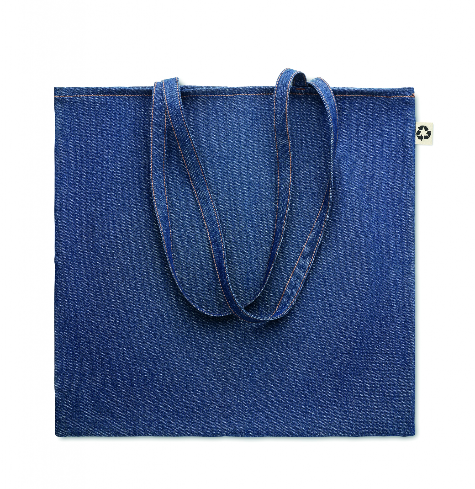 Tygkasse med långa handtag i 50 % återvunnen bomullsfärgad denim och 50 % bomull. Kvalité: 250 gr/m².