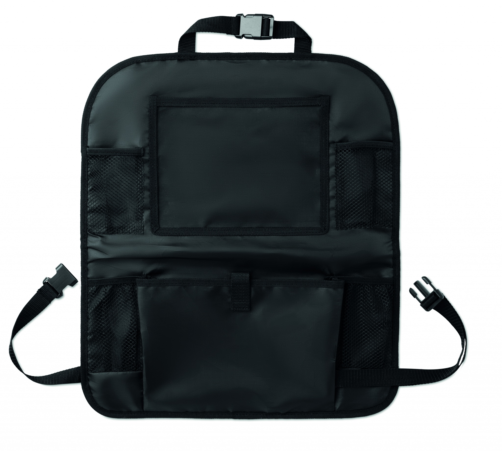 Bilsätes organisatör i 600D Polyester med flera praktiska fack, bl.a. för Ipad och telefonen. Förutom att förvara artiklar skyddar den bilsätet mot smutsiga barnskor.